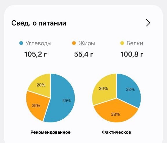 💥 «Бомбануло» по-научному: почему 400 г углеводов — это не забота, а вред? Сегодня меня снова «бомбануло» — простите, иначе не скажешь. Листаю очередной канал, вроде бы «прицельно нутрициологический», и натыкаюсь на фразу: «Для здоровья — особенно при сердечно-сосудистых заболеваниях — нужно 300–400 г углеводов в день». И это уже не первый раз. 🌀 Даже в новом фитнес-приложении от Samsung теперь стоит по умолчанию 50% углеводов от суточного рациона. Если вы тоже смотрите на кружочек( левый) в приложении — знайте, это не истина в последней инстанции. 💬 Теперь давайте я покажу, в чём тут подвох. Допустим, вы — женщина: средний рост, умеренная активность. Ваш рацион на снижение веса — это примерно 1200 ккал. Это почти базовый обмен. Считаем: Белки — чтобы сохранить мышцы. Жиры — для гормонов и мозга. И вот углеводы — аккуратно, дозированно.( справа) ❗️ И если вы на эти 1200 ккал бахаете 300–400 г углеводов, знаете что произойдёт? Вы худеете не жировой массой, а мышечной. А внешне —