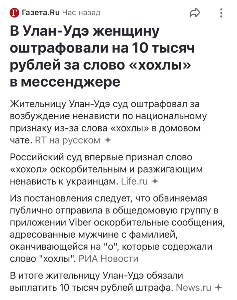 "Неисповедимы пути судейские!" – так и хочется сказать, перефразируя известное выражение. В новостной ленте появилась небольшая заметка, несерьезная, не про расстрел. Так, штраф пустяковый, 10 штук всего. За что? А вот тут интереснее... Читаем: Ну как тут не вспомнить сакраментальное: "Странно! Жопа - есть, а слова такого нет?" (С) Фаина Раневская. Ладно, ладно... Раневская - известный "хайпер" и любила эпатаж на грани фола. Посмотрим на классиков нашей литературы. М.Горький "Мать" — Какие вы! — сказала она хохлу (😱) как-то раз. — Все вам товарищи — армяне, и евреи, и австрияки, — за всех печаль и радость! М.Горький "Мои университеты" — Хохол (😱), вредная нация, турецкая вера! Отвечай — почему в церковь не ходишь, а? Д. Мамин-Сибиряк "Три конца" — Ну, а ты, Дорох, что нам скажешь? — пристают свои хохлы (😱) к Ковалю... А. Чехов "Убийство" С тех пор, как он пожил в одной тюрьме вместе с людьми, пригнанными сюда с разных концов, — с русскими, хохлами (😱), татарами, грузинами, китайца