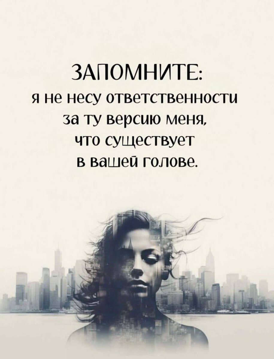 Не путай меня со своим воображением Я не обязана оправдывать ожидания, которые сама никогда не обещала. Не должна подстраиваться под картинку, что вы нарисовали в своей голове. И уж точно не собираюсь быть удобной, чтобы совпасть с чьими-то фантазиями. Ваша версия меня - это ваша история, собранная из обрывков фраз, случайных взглядов и ваших собственных выводов. Но это не я. Моя ответственность - это быть честной с собой, а не соответствовать вашему сценарию. И если реальность не совпадает с выдумкой, значит, проблема в иллюзии, а не во мне.
