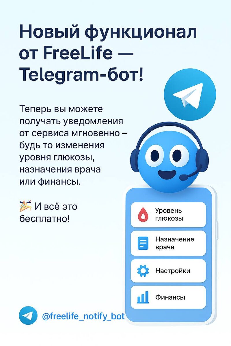 📢 Встречайте новый функционал FreeLife — Telegram-бот! У нас отличные новости — мы продолжаем делать FreeLife ещё удобнее для вас, и запускаем новый Telegram-бот https://t.me/freelife_notify_bot Теперь все важные уведомления о вашем состоянии, изменениях в сервисе и рекомендациях от врача будут приходить прямо в Телеграм — быстро, красиво и удобно! ❓Что умеет Telegram-бот? Бот создан для того, чтобы оперативно уведомлять вас о важных изменениях, связанных с вашим здоровьем и системой мониторинга FreeLife: 🔔 Уровень глюкозы вышел за пределы — вы узнаете об этом мгновенно ⚠️ Сбой в работе сенсора или сервера — не останетесь в неведении 📩 Новое назначение врача или изменение в дневнике — сразу увидите 🔧 Настройки системы были изменены — получите уведомление 💰 Финансовые события — поступления, списания и т.д. ⠀ Всё это — в одном месте, удобно, наглядно и с возможностью настройки Почему Telegram-бот — это удобно? ✨ Красочно и понятно В отличие от сухих SMS, бот поддерживает