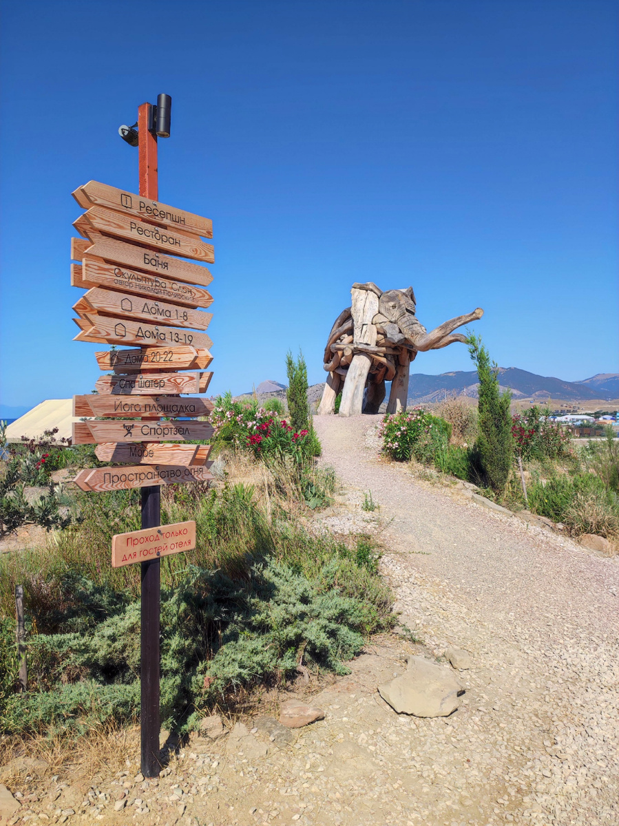 Проводить закат, встретить рассвет, никуда не торопиться и ещё, чтобы вкусно кормили - чем не мечта. И исполнилась она в Крыму, недалеко от Судака, в глэмпинге "Слон в удаве". Мы четыре года подряд отдыхаем в одном и том же месте, а в этот раз, в своё 35-летие, мне захотелось хотя бы на один день почувствовать себя героиней какого-нибудь романтического сериала, где она со своей семьёй живёт на шикарной вилле у моря. Это хоть и не вилла, а глэмпинг на склоне бухты Капсель, но с очень красивым видом на живописный морской берег. Дом с панорамными окнами в идеале рассчитан на двух человек, но нам и троим было комфортно. Большая кровать, стол со стульями, холодильник, кондиционер, чайник, даже своя личная пальма в горшке. В качестве комплимента нам положили три нектаринки и рахат лукум. Очень приятно! В ванной комнате есть фен к моему счастью, так как мой в начале отпуска взял и сломался, необходимые гигиенические принадлежности, но всего один крючок на стене. Совершенно некуда повесить