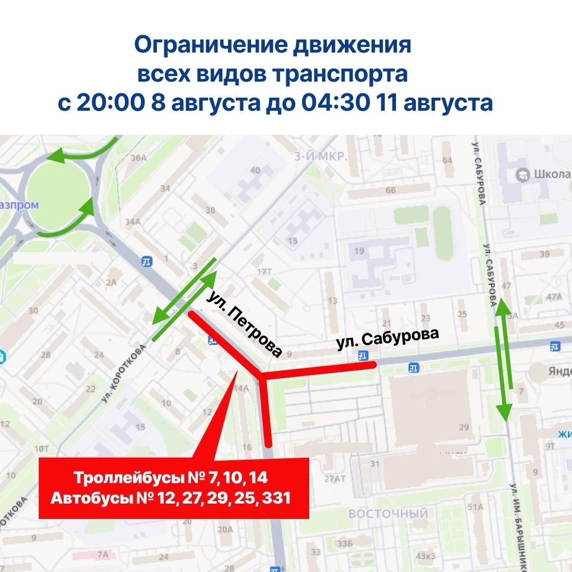 🚧Перекресток у ТЦ «Петровский» перекроют в Ижевске на выходные Движение всех видов транспорта перекроют на перекрестке улиц Петрова и Сабурова. Это связано со строительством перемычки водопроводной сети, сообщает пресс-служба Администрации Ижевска. 🕐Движение всех видов транспорта на перекрестке закроют с 20:00 8 августа и до 4:30 11 августа. 🚌Маршруты всех троллейбусов и автобусов, пролегающие через перекресток, перенаправят на другие улицы (смотрите таблички). Водителей просят учитывать изменения и продумывать объездные маршруты заранее. Фото: Администрация Ижевска Подписывайся на Ижевский бизON #Ижевск