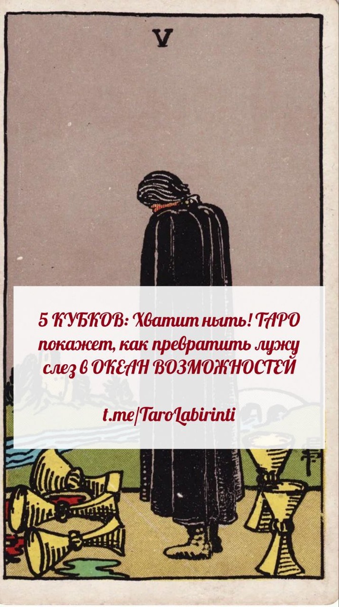 🌧 5 КУБКОВ: Хватит ныть! ТАРО покажет, как превратить лужу слез в ОКЕАН ВОЗМОЖНОСТЕЙ 🌧 🖇5 Кубков в Таро часто изображает человека, скорбящего о пролитых кубках, не замечая двух полных, стоящих позади. 🔗Традиционно карту толкуют как потерю, сожаление и зацикленность на прошлом. 🔍Я предлагаю посмотреть на нее под другим углом: как на привычку жаловаться и нежелание видеть хорошее.⬇️ ✅Не просто грусть, а стиль жизни: 🟢Символизм: Человек смотрит только на пролитые кубки (негатив), игнорируя полные (позитив). 🟢Значение: Привычка фокусироваться на неудачах, вместо того чтобы искать возможности. Постоянное нытье и жалобы на жизнь, которые отталкивают окружающих. 🟢Ключевая фраза: “У меня всегда все плохо!” 🔍 Почему это происходит? (Психологический разбор) 🧠 ➡️Привлечение внимания: Жалобы - способ получить сочувствие и поддержку. ➡️Избегание ответственности: Перекладывание вины за неудачи на других или обстоятельства. ➡️Страх успеха: Подсознательное неверие в свои силы и бо