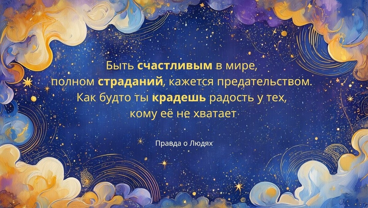 Результат — поколения людей, которые чувствуют вину за собственную радость. Стыдятся успеха. Извиняются за то, что им хорошо, когда другим плохо.