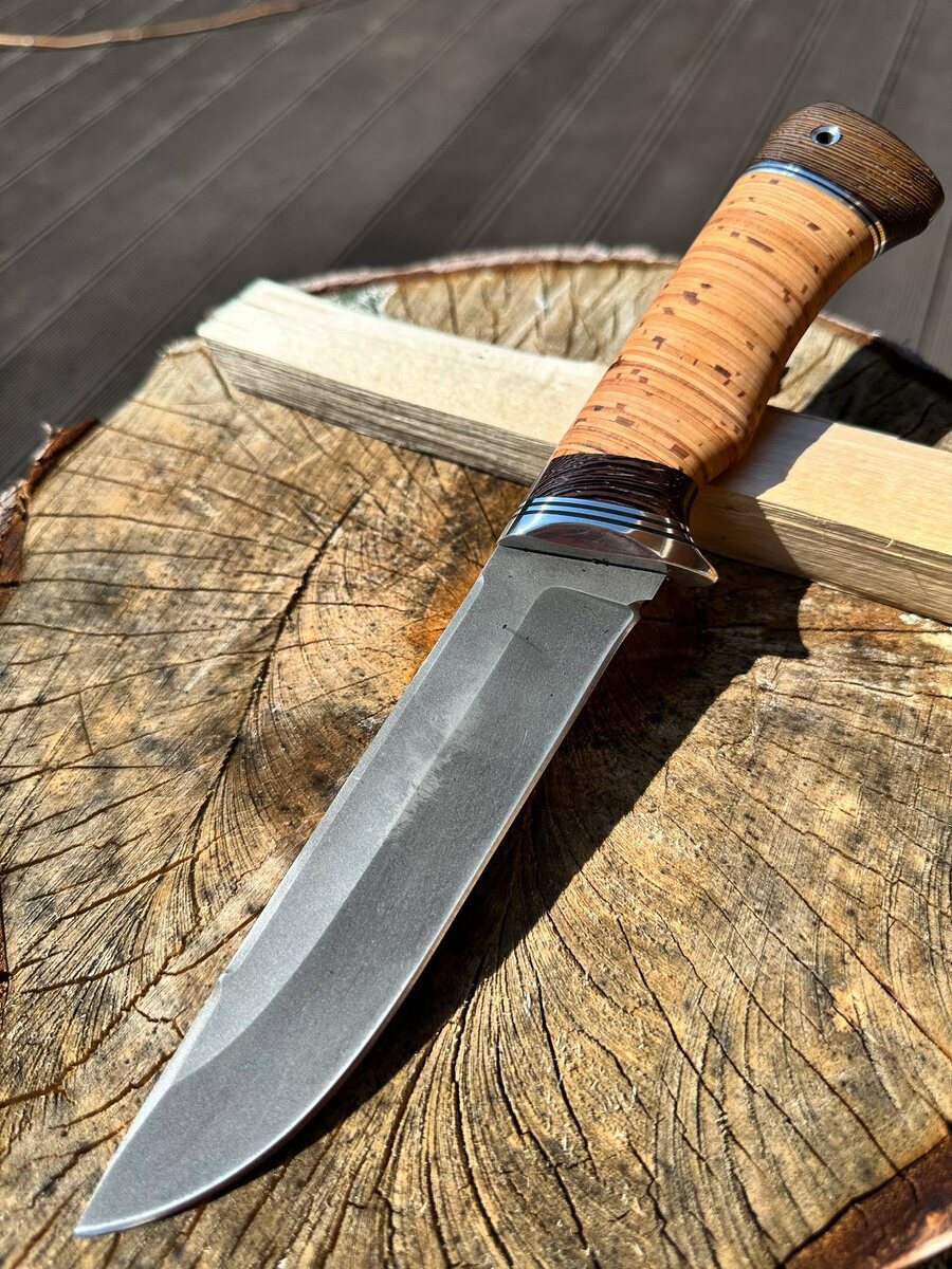 - Рукоять из бересты — тёплая, приятная на ощупь, с анатомической формой для уверенного хвата даже в перчатке или влажной руке.