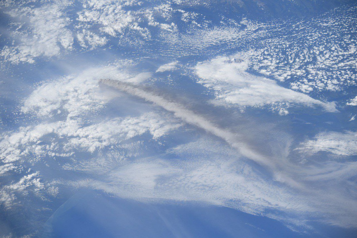Столб пепла прорвался через густые облака, окутавшие в тот момент Камчатку. С МКС видно, как столб широким шлейфом рассеивается в атмосфере.