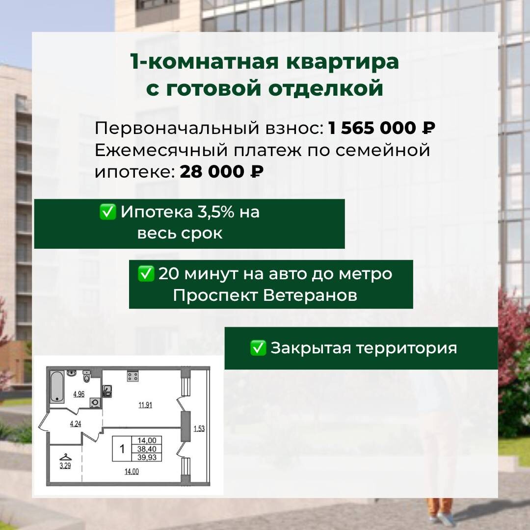 Если вы подбираете квартиру, которая подойдёт как для жизни, так и для долгосрочных инвестиций — обратите внимание на этот проект ⬇️ 1-комнатная квартира с готовой отделкой Уютная, светлая квартира с просторной лоджией. Отличный вариант для тех, кто ценит комфорт, тишину и свежий воздух, но не готов жертвовать доступом к городской инфраструктуре. Почему я рекомендую этот проект: Жилой комплекс расположен всего в 5 минутах от КАД, к югу от границы Петербурга. До центра города — полчаса на авто, а до Петергофа — всего 20 минут. Поблизости — лес, озёра, обустроенные пляжи и всё, что нужно для жизни: школы, сады, магазины, кафе. На территории появится собственная школа, а дворы будут закрыты от посторонних. Условия покупки: Первоначальный взнос: 1 565 000 ₽ Семейная ипотека 3,5% на весь срок Ежемесячный платёж: 28 000 ₽ Формат подойдёт и для жизни, и для аренды. Хотите рассмотреть другие варианты? Напишите мне @JEIN_Gai4ka , помогу с выбором 🤍