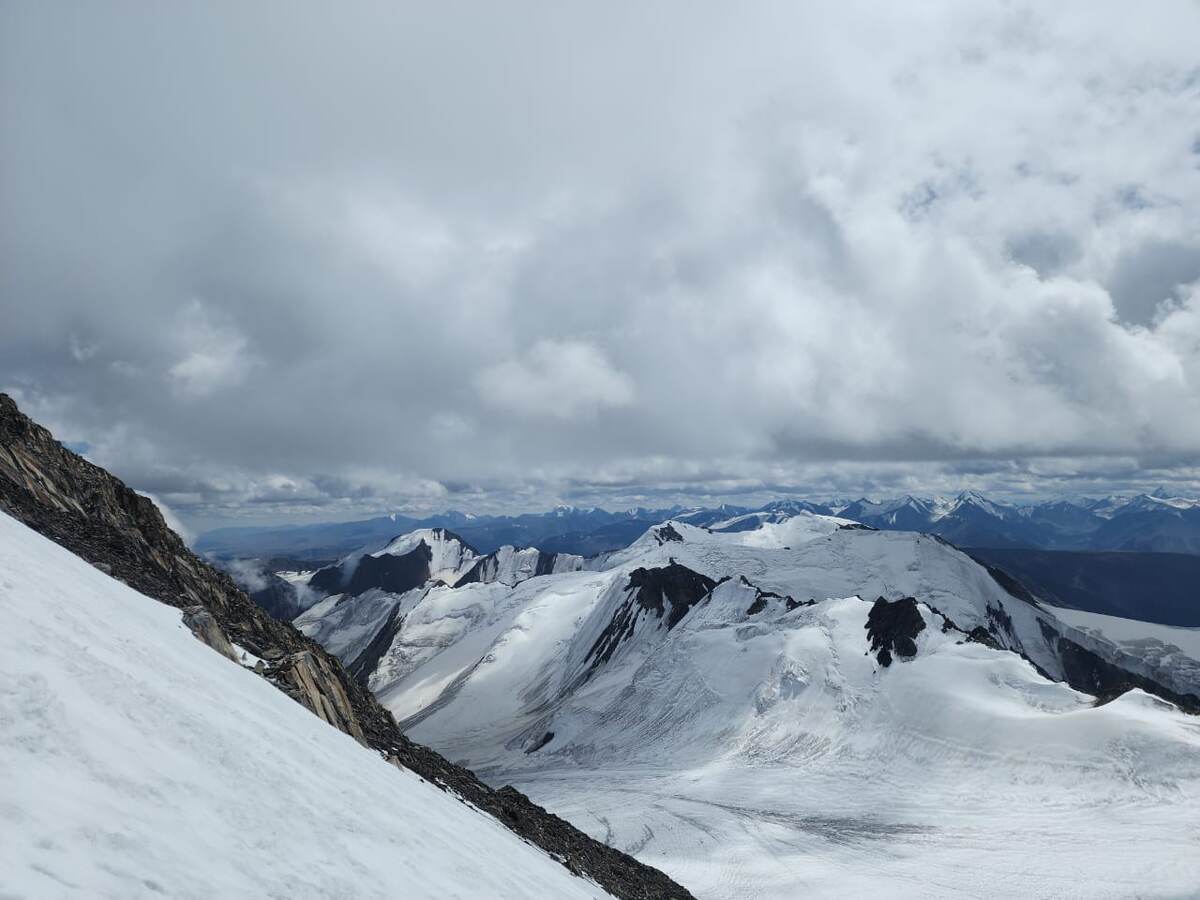 — Вот мы все выше и выше, и уже находимся на Северо-Чуйском хребте, а с него видно Южно-Чуйский хребет. Прям красиво, прям классно, здорово! Не в первый раз говорю, многое зависит от погоды. Нам повезло в этот момент. Было голубое небо, солнышко. Всё красиво. Потом поднялись наверх, на гребень. К слову, вот этот склон в 300 метров длиной мы преодолевали 4 часа. Это прям было очень тяжело. С помощью жумара нам инструктор натягивал верёвки в 30-50 метров. Представляете, 50 метров верёвку нужно пройти! Ты этим жумаром руку вверх поднимаешь, потом подтягиваешь ноги по склону, а чем круче склон, тем тяжелее это делать. На третьей или четвертой веревке ты уже просто начинаешь задыхаться, тебе не хватает дыхания. И ты стоишь, отдыхаешь, продышался, опять пошел. Вот у меня было именно так. Там, на гребне, эмоций особо нет от красоты, но есть эмоции, что ты это преодолел, что ты уже на гребне.