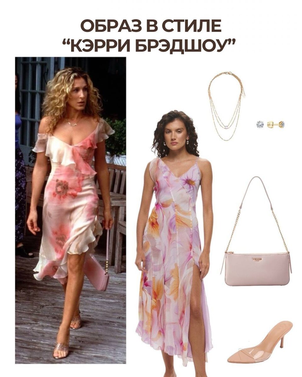 Девчонки, предлагаю сегодня повторить романтичный образ Кэрри из сериала «Секс в большом городе»🌆 Ловите ссылки на вещи 🤍 🤎Платье Mango - 6500р 🤎Сабо Vivian Royal - 6450р 🤎Сумка Twinset Milano - 10780р 🤎Колье Marmalato - 590р 🤎Серьги Sokolov - 2909р Стоимость такого образа из пяти вещей - 27 229р Как вам рубрика? Делать ещё такие повторения луков главных героинь? 🔥 #каквфильме