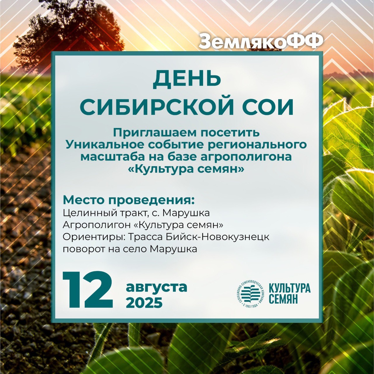 ❤️🔥Приглашаем на «День Сибирской сои» 12 августа на агрополигоне «Культура семян»! Совершенно новый проект, при содействии Министерства сельского хозяйства Алтайского края, не имеющий аналогов в Сибири. 🌱Около двухсот сортов различных культур, в том числе 49 сортов сои. На базе агрополигона “Культура Семян” испытали перспективные сорта и схемы защиты, в том числе от компании “ЗемлякоФФ”. Вас ждут три делянки с разными схемами защиты нашими препаратами! Приходите на мероприятие и выбирайте наиболее урожайные варианты для сельхозтоваропроизводителей Сибири! 🗓️12 августа 10:00-16:00 📍Место проведения: Целинный тракт, с. Марушка Агрополигон «Культура семян» Ориентиры: Трасса Бийск-Новокузнецк поворот на село Марушка