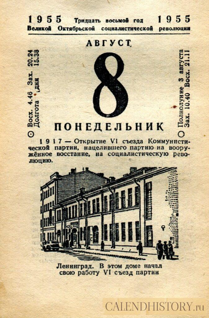 Итак, сегодня 8-августа и у нас на календаре 1955-й год. Перед нами листок советского календаря Политиздата. На календаре у нас понедельник - 8 августа 1955-го года. Ленинград. В этом доме начал свою работу VI съезд партии 1917 — Открытие VI съезда Коммунистической партии, нацелившего партию на вооружённое восстание, на социалистическую революцию. *** Оборотную сторону листка этого календаря можно посмотреть у нас по ссылке на сайте. Другие листки советских календарей смотрите у нас на сайте - CALENDHISTORY.ru ПОСМОТРИТЕ ЕЩЁ ЛИСТКИ ОТРЫВНЫХ КАЛЕНДАРЕЙ: