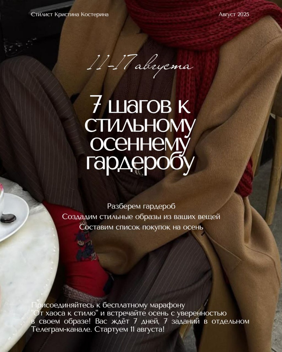 🎞️ От хаоса к стилю: 7-дневный марафон осенних образов! Август — переходный месяц, когда мы начинаем думать об осеннем гардеробе. А я предлагаю не только думать, но и делать - прямо сейчас стильно подготовиться к осени. Присоединяйтесь к бесплатному марафону "От хаоса к стилю" и встречайте осень с уверенностью! За 7 дней вы: 🎞️ Разберёте гардероб и найдёте в нём скрытые сокровища. 🎞️ Соберёте 3-5 ярких осенних образов без лишних трат. 🎞️ Поймёте, как вписать тренды осени-2025 в свой стиль. 🎞️ Научитесь создавать образы, которые работают на вас! Как это будет? 🎞️ 7 дней, 7 простых заданий в отдельном Telegram-канале. 🎞️ Чёткие советы, примеры и шаги к порядку в гардеробе. 🎞️ Интерактив: делитесь результатами в чате или stories, получайте фидбэк и вдохновение! ❤️ Бонус для активных! Среди тех, кто выполнит все задания, разыграю личную консультацию по стилю — ваш шанс создать гардероб мечты с моей помощью! Как участвовать? ✨ Подпишитесь на канал марафона - ссылка в коммент