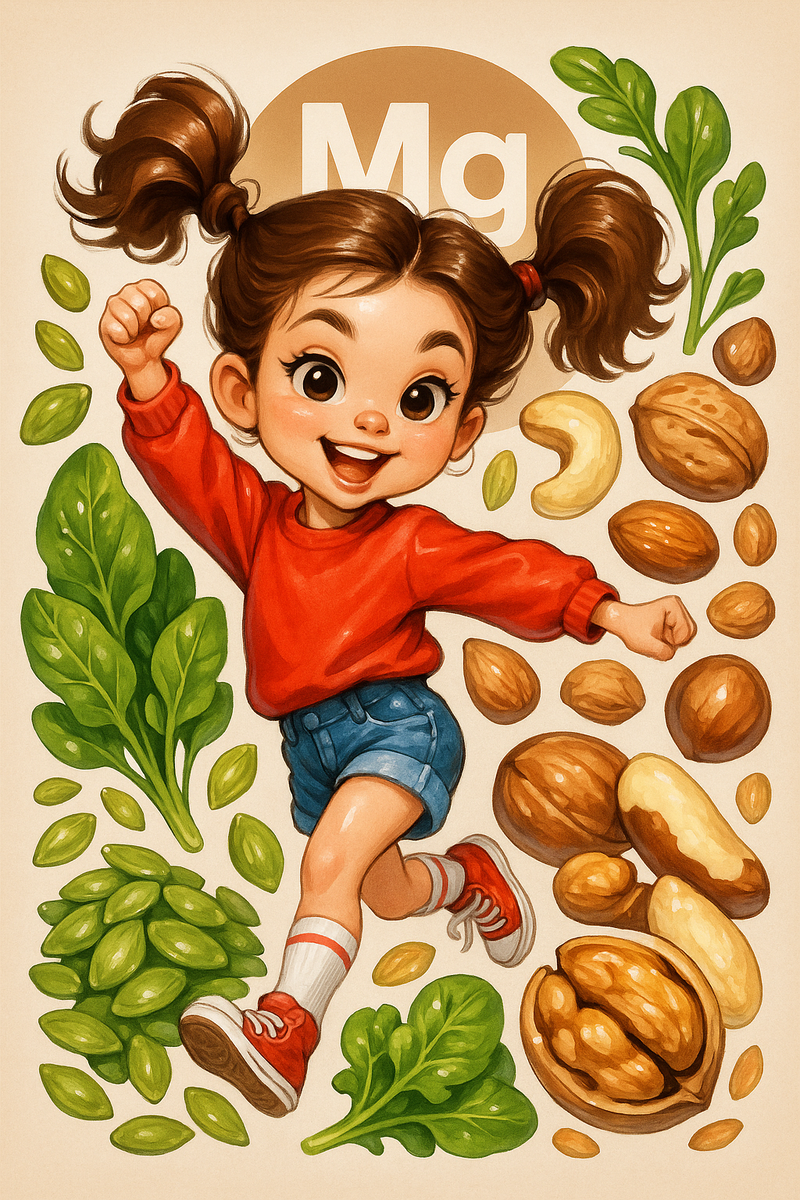 - Сбалансированное питание: включайте в рацион ребёнка зелёные овощи, тыквенные семечки, орехи и отруби — это естественные источники магния.