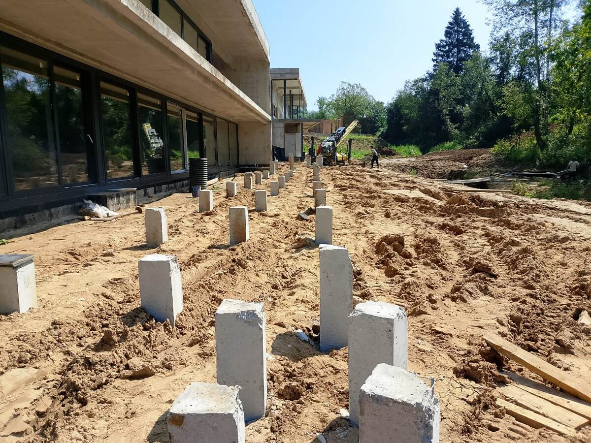 Для террасы смонтировали забивные железобетонные сваи сечением 250 × 250 мм и длиной 5 м в количестве 35 штук. В дальнейшем верхушки свай подвергнут распушению, то есть удалению бетона из верхней части и выпуску арматуры. А затем будет залита монолитная плита, образуя так называемый свайно-плитный фундамент.