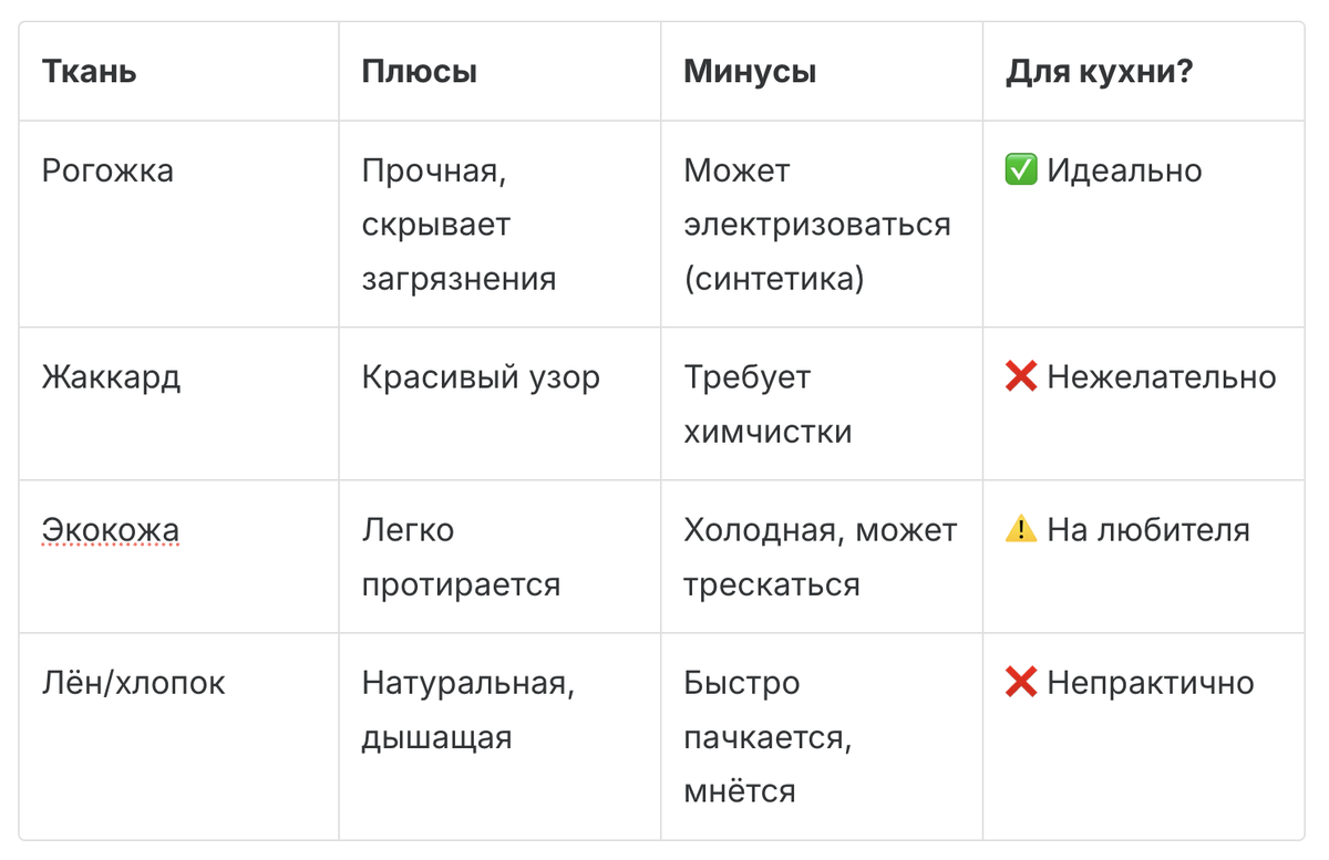 Если вы ищете обивочную ткань для кухонных стульев, которая сочетает долговечность, простой уход и современный дизайн, то рогожка – отличный вариант. Рассказываем, что это за материал, почему он идеально подходит для кухни и как за ним ухаживать. Рогожка – это плотная мебельная ткань с характерной рельефной текстурой в виде мелкого переплетения нитей (напоминает мешковину, но мягче и приятнее на ощупь). ● Натуральные волокна (хлопок, лён) – экологично, но менее износостойко. ● Синтетические нити (полиэстер, акрил) – более практично для кухни. ● Смесовые составы (хлопок + полиэстер) – баланс комфорта и прочности. 👉 Пример: ткань из 65% полиэстера и 35% хлопка не мнётся, отталкивает влагу и легко чистится. ● Плотное плетение защищает от затяжек и истирания. ● Не боится когтей животных (актуально для питомцев). ● Не впитывает пятна – пролитый чай или соус можно быстро вытереть. ● Можно чистить влажной губкой (для смесовых и синтетических вариантов). ● Рельефная фактура скрывает мелкие