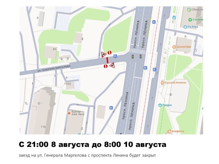 Изменения вступят в силу с 21:00 8 августа и будут действовать до 08:00 10 августа. В этот период будет закрыт заезд на улицу Генерала Маргелова с проспекта Ленина.