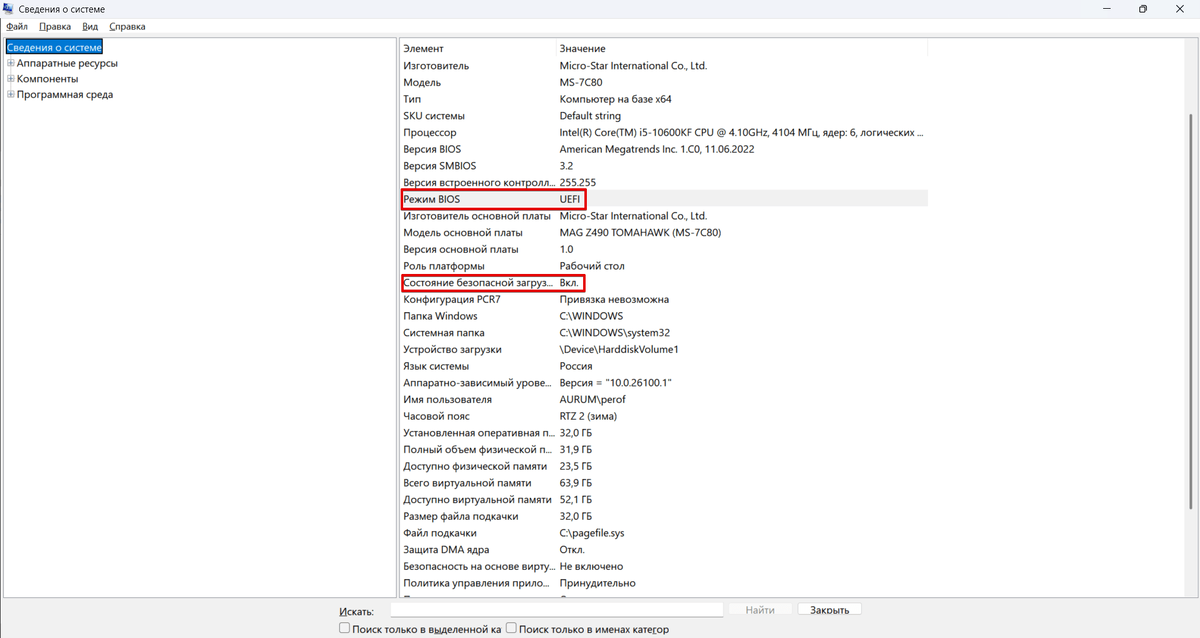 Жмём Win + R, вводим msinfo32 и с надеждой смотрим: