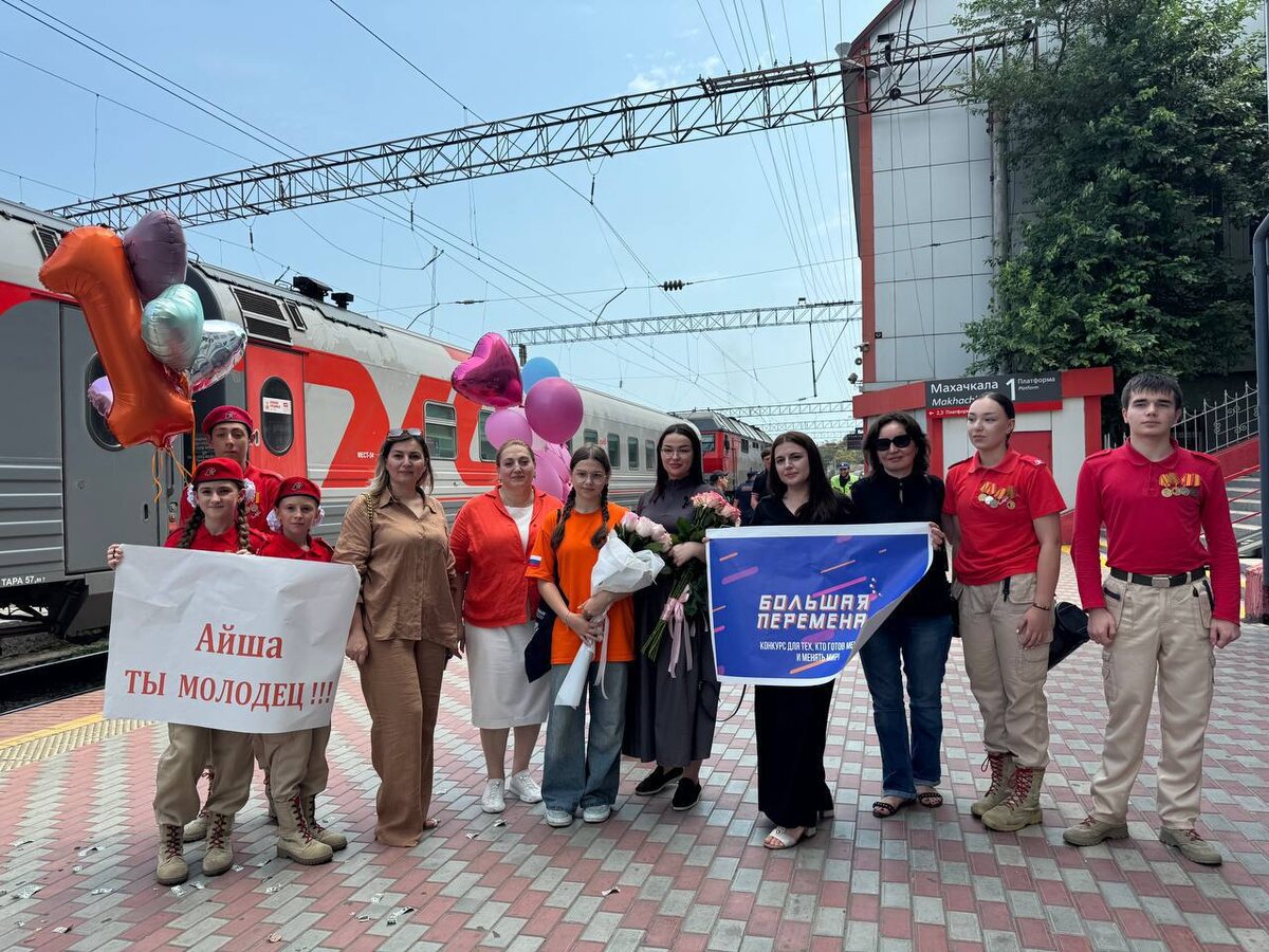 ⭐️Айшу Агабекову торжественно встретили на вокзале в Махачкале — она привезла победу с Всероссийского конкурса "Большая перемена" 🥇Айша Агабекова — ученица 8–3 класса МБОУ «Многопрофильная гимназия №38» г. Махачкалы стала победительницей всероссийского конкурса для школьников «Большая перемена». На железнодорожном вокзале её встретили представители гимназии, Центра развития талантов «Альтаир», родные и друзья. ‼️Конкурс «Большая перемена» — один из крупнейших проектов президентской платформы Россия — страна возможностей. Он ежегодно собирает самых инициативных, творческих и целеустремлённых школьников со всей страны. Участники соревнуются в решении нестандартных задач, представляют проекты и проходят испытания на командную работу, лидерство и креативность. ⚡️Айша уверенно прошла все этапы и стала первой победительницей в своей возрастной категории от Дагестана. Главный приз конкурса — уникальное путешествие на поезде от Москвы до Владивостока и обратно, с остановками в крупнейших г