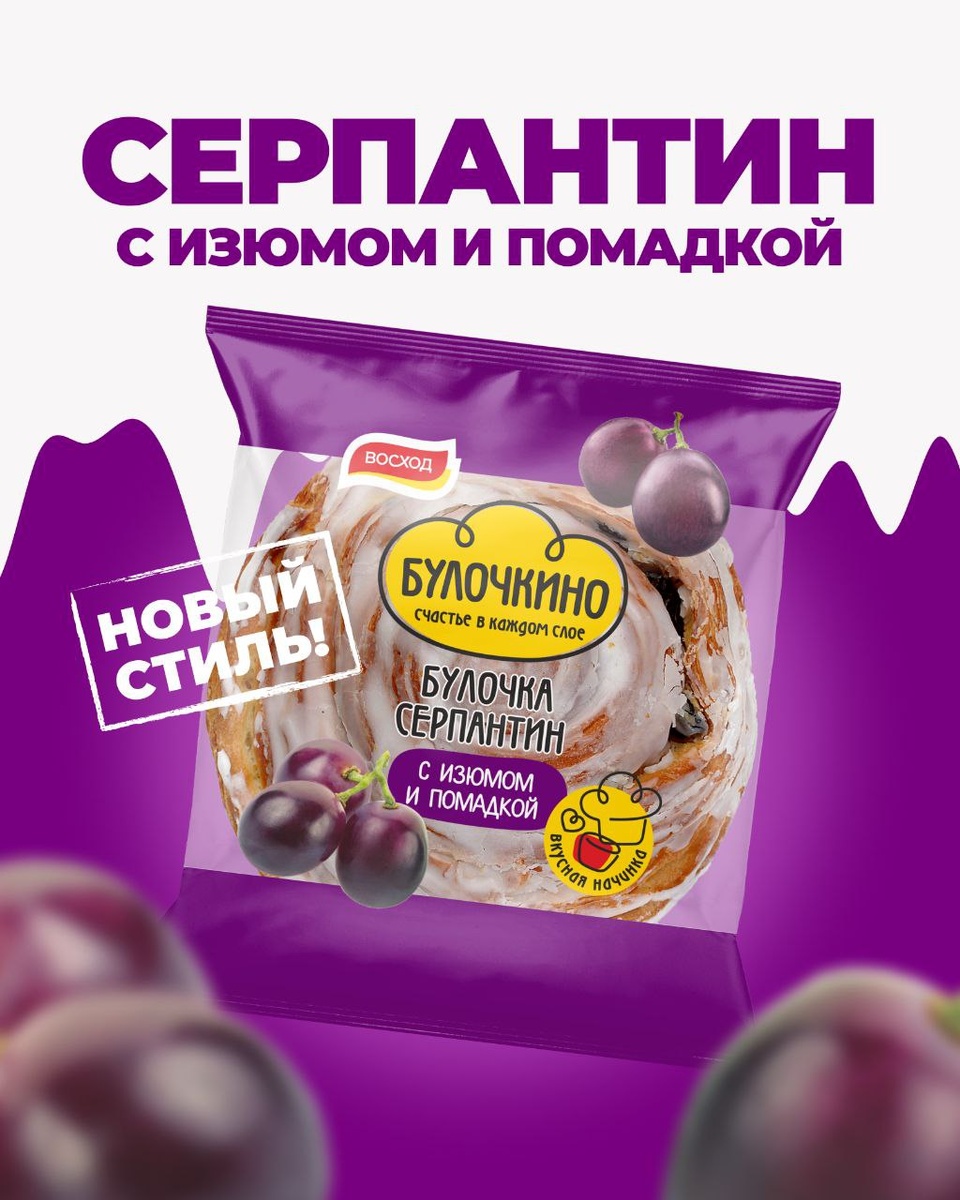 🟣🟣🟣 Встречайте обновлённый “Серпантин” от «Восхода»! Мы знаем, как вы любите наши булочки “Серпантин” за их нежный вкус, воздушную текстуру и неповторимый аромат, напоминающий о домашнем уюте. И мы рады представить "Серпантин" в новом образе! ⭐️Новая упаковка — ещё больше радости! Мы обновили дизайн упаковки, чтобы вам было ещё проще найти любимую булочку на полках магазинов. Яркий, стильный, запоминающийся — он обязательно привлечёт ваше внимание! Но главное, это не только про красоту. Новая упаковка надежно сохраняет свежесть и мягкость “Серпантина”, чтобы каждая булочка дарила вам максимум удовольствия. Представьте: ароматный “Серпантин”, свежезаваренный чай, уютный вечер в кругу семьи… Разве это не идеальный сценарий для счастья? Наши булочки созданы, чтобы дарить вам тепло и радость. Разделите вкус “Серпантина” с близкими и создайте незабываемые моменты и вкусные эмоции вместе! Ищите “Серпантин” в новой упаковке в магазинах: Магнит, Пятерочка, Лента, Монетка, Ашан и Метро