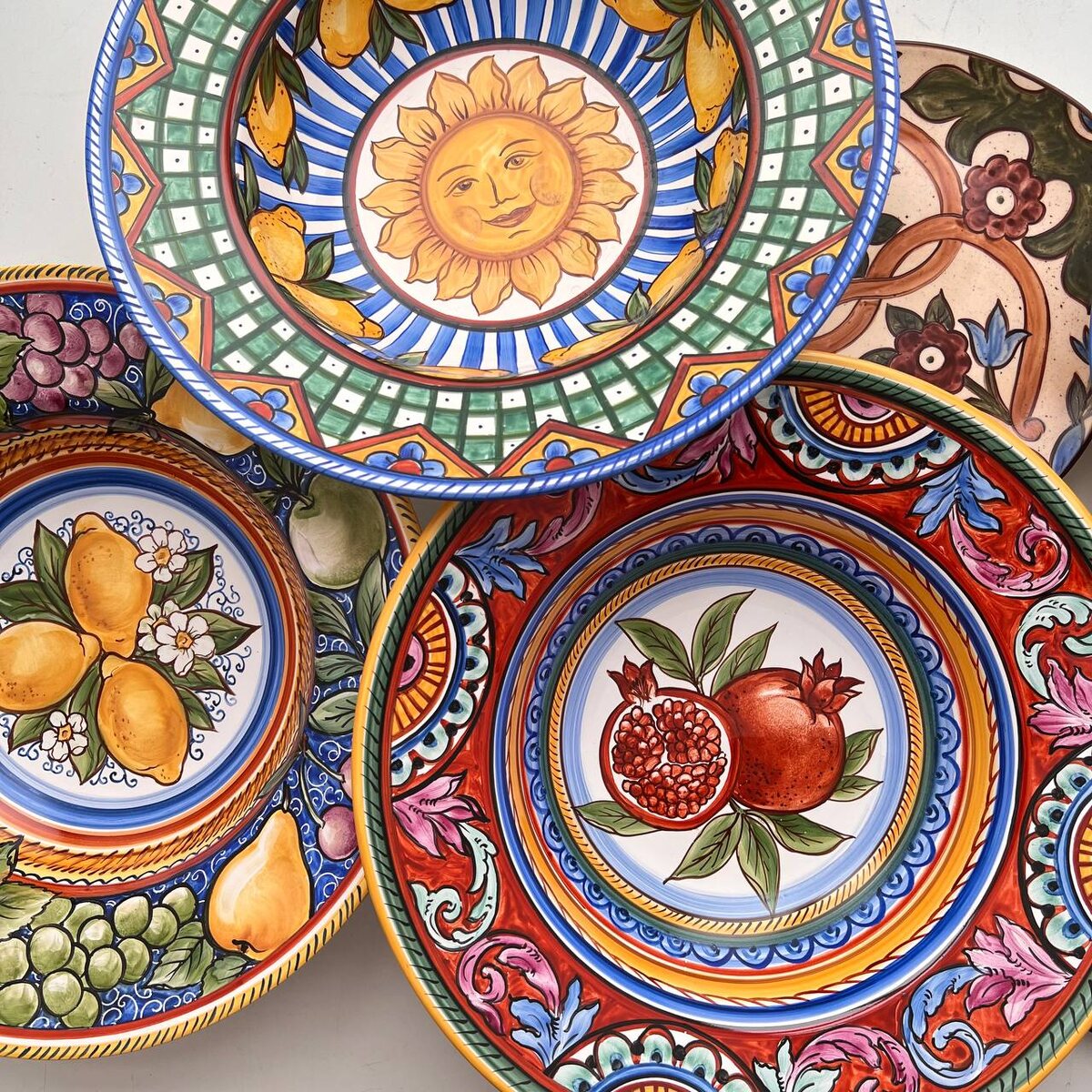 Стремясь удержать лето за хвост, снова собрала свою самую знойную подборку работ. Называю ее в стиле дольче вита. По мотивам итальянских и сицилийских майолик, этнической росписи по керамике "талавера" - испанские, мексиканские мотивы. Получился такой вот "взрывной микс". Характерные черты стиля - яркие жизнерадостные краски, орнамент, растительные и геометрические узоры с побегами и плодами средиземноморских фруктов. Гроздья винограда, гранат, лимоны, инжир, груша, персик. Всё наполнено солнцем, позитивной энергией. Цвета словно позаимствована у природы, солнца, неба, растений: песочный, оранжевый, кобальтовый синий, оливковый... Поскольку я люблю эксперименты, с удовольствием включаю в некоторые работы сельские пейзажи Средиземноморья. Маковые поля Прованса, подсолнухи Тосканы. Столовый сервиз на 6 персон. Накрыла стол на своей даче). Чем ярче дом, тем ярче жизнь! Благодарю за внимание!) Подписывайтесь на мои соц.сети. Буду очень рада. Ежедневно размещаю много видео и фотографий.