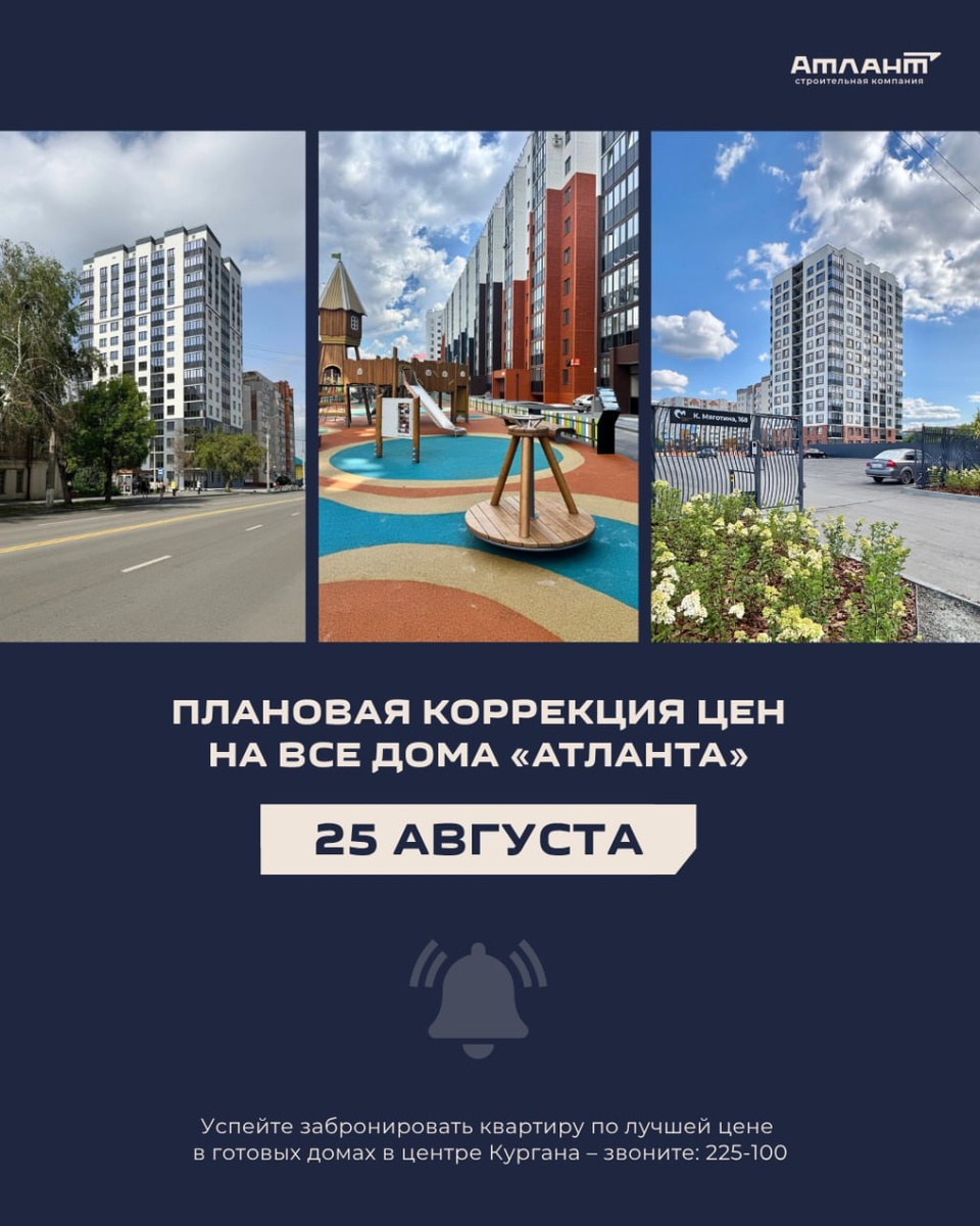 🔔 Внимание! Плановая коррекция цен на все квартиры в домах «Атланта» 📆 Дата повышения цен: 25 августа. Остается две рабочих недели, чтобы забронировать квартиру в новых, готовых домах в центре города по лучшей цене на сегодняшний день. Ключи отдаем в день сделки! Топ-5 причин, почему курганцы выбирают «Атлант»: 1️⃣ удобные локации с готовой инфраструктурой; 2️⃣ одни из лучших современных детских площадок; 3️⃣ бесплатные парковочные места; 4️⃣ собственная газовая котельная; 5️⃣ современное озеленение и освещение. ☎️ Запишитесь на индивидуальную экскурсию и оцените будущую квартиру, двор и район в живую. Звоните сейчас по телефону: 225-100. Выбирайте планировку на сайте: atlant45.ru