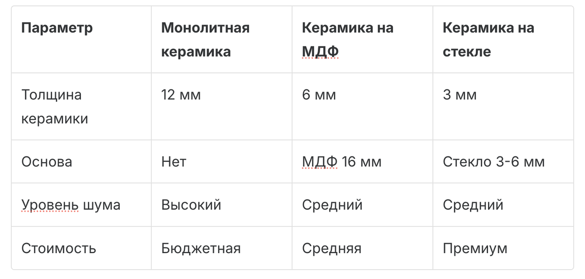 Керамические столешницы становятся всё популярнее благодаря своей прочности и эстетике. Но не все знают, что технологии их монтажа могут существенно отличаться. Разберём три основных варианта исполнения керамических столешниц для кухонных столов. Характеристики: ▪ Толщина керамики около 12 мм ▪ Особенности: обратная сторона часто имеет "технический" рисунок, как у напольной плитки ▪ Монтаж: крепится непосредственно к каркасу стола Плюсы: ✔ Самая доступная цена ✔ Простая конструкция ✔ Достаточная прочность для бытового использования Минусы: ▪ Может быть более звонкой при контакте с посудой ▪ Ограниченный выбор расцветок Для кого: идеальный вариант для тех, кто ищет недорогой практичный стол с керамической столешницей. Характеристики: ▪ Толщина керамики: около 6 мм ▪ Основа: МДФ 16 мм с защитным покрытием ▪ Особенности: более тонкая, но качественная керамика Плюсы: ✔ Меньше резонанса и шума от посуды ✔ Более богатый выбор дизайнов ✔ Оптимальное сочетание цены и качества Интересн