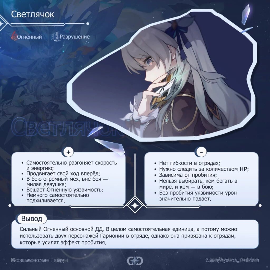 ㅤНе так давно, а именно 23-го июля, началась вторая фаза патча 3.4. В ней в баннерах вновь появились три персонажа Пути Разрушения — Светлячок, Цзинлю и Блэйд. ㅤВ этой статье вы увидите краткое описание их особенностей, чтобы понять — стоит ли крутить кого-то из них. ㅤСветлячок — персонаж с Огненным типом урона, ставшая игровой в 2.3. Она является основным ДД, играющим от пробития уязвимости, поэтому самой важной для неё характеристикой является эффект пробития. Ей также важны сила атаки и скорость. ㅤГлавная её особенность заключена в сверхспособности — она позволяет Сэму перейти в состояние Полного сгорания, которое повысит характеристики, а также усилит навык и базовую атаку. ㅤОна не является сильно требовательной к Эйдолонам, однако второй Эйдолон ей очень полезен, ведь он даёт возможность получить дополнительный ход во время использования сверхспособности. С сигнатурным конусом ситуация схожа — он будет прекрасным дополнением для персонажа, но его заменой могут послужить и другие к