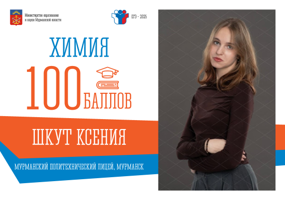 Ксения Шкут, выпускница Мурманского политехнического лицея, обучалась в классе химико-биологического профиля. Она получила 100 баллов на ЕГЭ по химии – добиться такого высокого результата можно только упорным трудом! Целеустремленная, настойчиво идущая к осуществлению своей мечты – стать врачом, – девушка всегда с удовольствием занималась химией и биологией не только в учебной, но и во внеурочной деятельности.