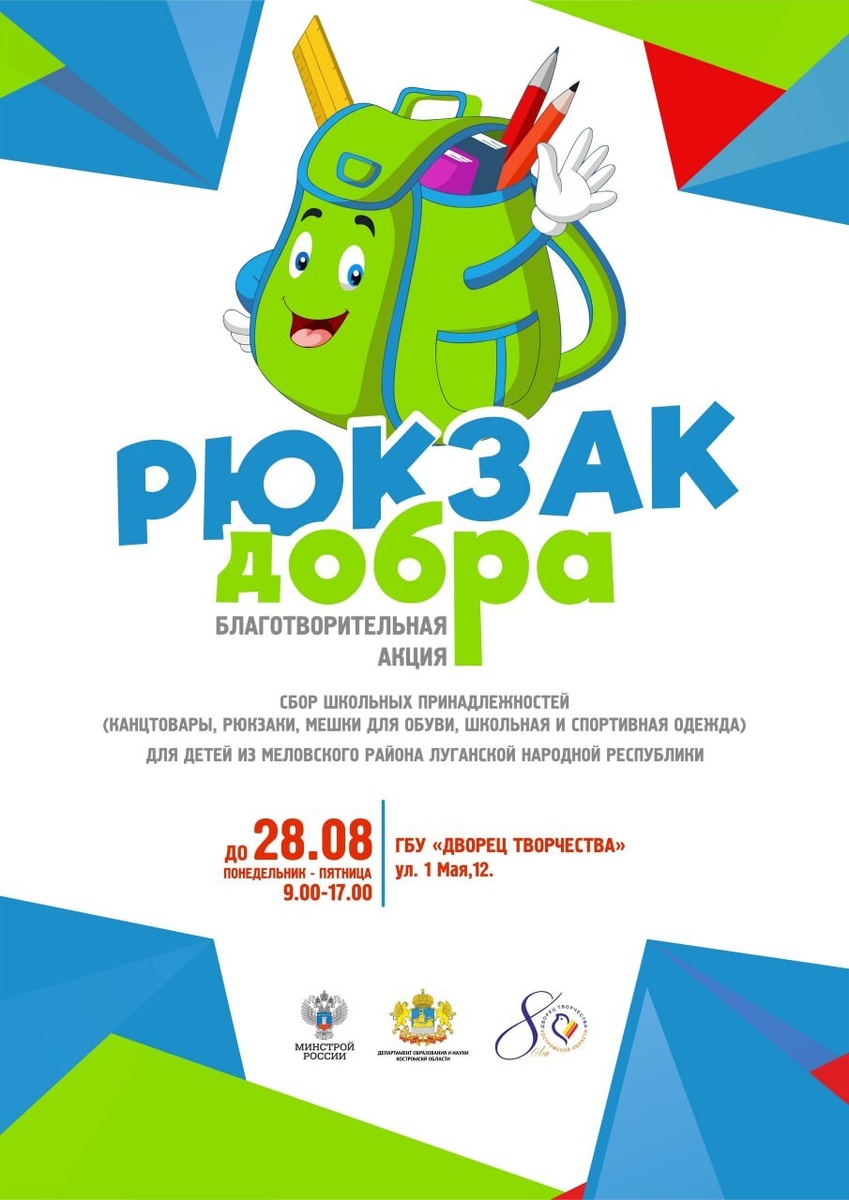 Благотворительную акцию организовал Департамент образования и науки Костромской области Костромичам предлагают поучаствовать в сборе «Рюкзака добра» для школьников из Меловского района Луганской Народной Республики. Благотворительную акцию в преддверии Дня знаний организовал Департамент образования и науки Костромской области. Все желающие могут принести школьные принадлежности, канцелярию, новые рюкзаки, мешки для обуви, а также ученическую форму и детскую спортивную одежду. Вещи принимаются до 28-го августа включительно в рабочие дни с 9:00 до 17:00. Принести школьный инвентарь можно во Дворец творчества по адресу: улица 1 Мая, 12.