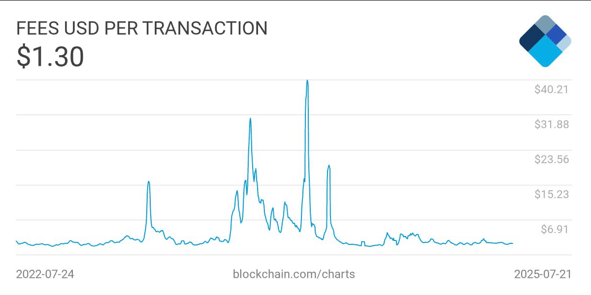 По данным сервиса Blockchain.com, транзакционные комиссии в сети биткоина в июле оставались на самом низком уровне с апреля. В течение месяца сборы варьировались от $1,10 до $1,30.