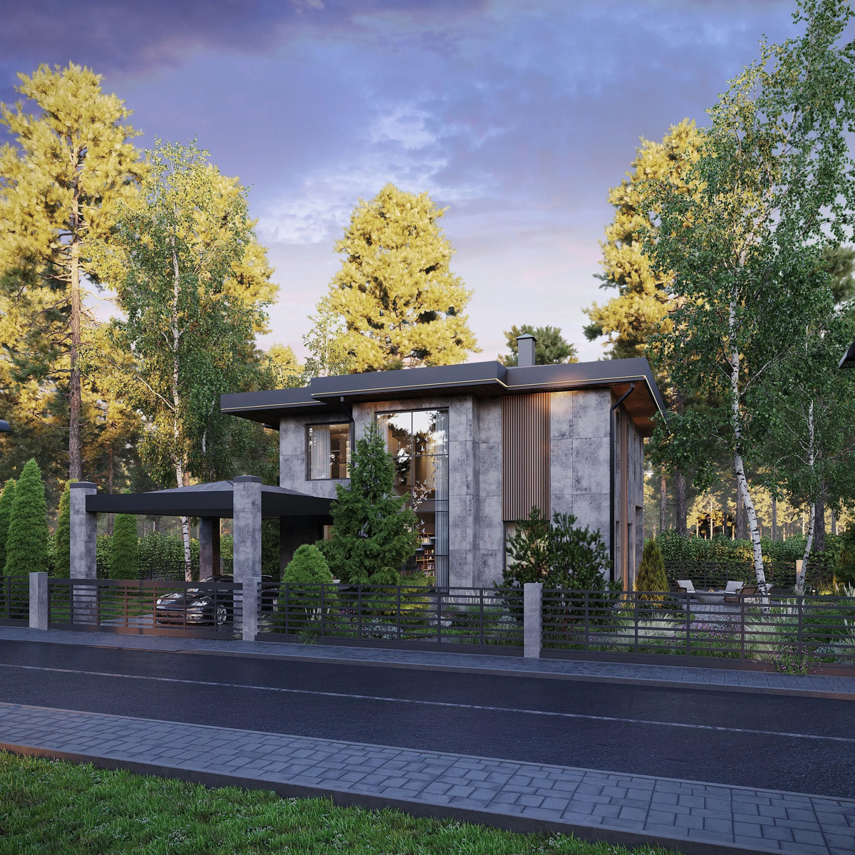 Дом выполнен в лаконичном современном стиле, в котором сочетаются бетонные поверхности и деревянные вставки. Такое сочетание материалов придаёт зданию элегантность и теплоту. Большие окна обеспечивают естественное освещение интерьера и позволяют наслаждаться видом природы. Просторный участок окружён деревьями, создавая ощущение уединения и гармонии.