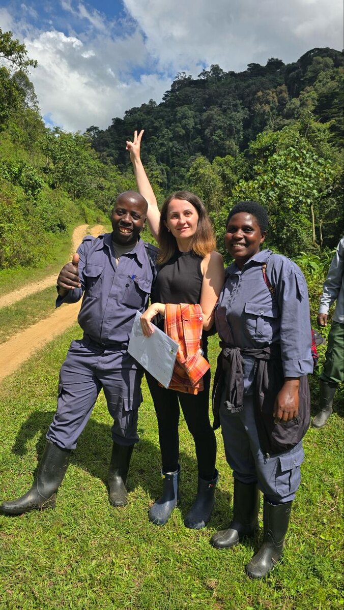 🇺🇬🦍 ТРЕКИНГ К ГОРНЫМ ГОРИЛЛАМ В УГАНДЕ - НАЧАЛО 🤩 Этим утром нас провожали как героев с песнями и танцами местного ансамбля. ✌️ 😠 И после финального инструктажа всех туристов распределили по группам, каждая из которых должна была отправиться к определенной семье горилл в сопровождении своего рейнджера и его/ее команды помощников. 🤟 А также предложили воспользоваться услугами персональных носильщиков-помощников (жителей местной деревни). 🤔 Внимательно обдумав и взвесив все «за и против» (см. предыдущий пост) я попросила предоставить мне в помощь ДВОИХ человек! Хитрость идеи заключалась в том, чтобы один человек нес мою поклажу, а второй меня, когда возникнет такая необходимость 😏 (основано на печальном опыте предшествующего легкого трекинга к шимпанзе, во время которого я увязла ногой в болоте – хорошая тема для следующего поста 🫧). 🤣 А вот воплощение идеи оказалось пафосным и весьма комичным: Вот иду я: под руку меня ведет девушка, а за нами шагает парень с моим рюкзачком