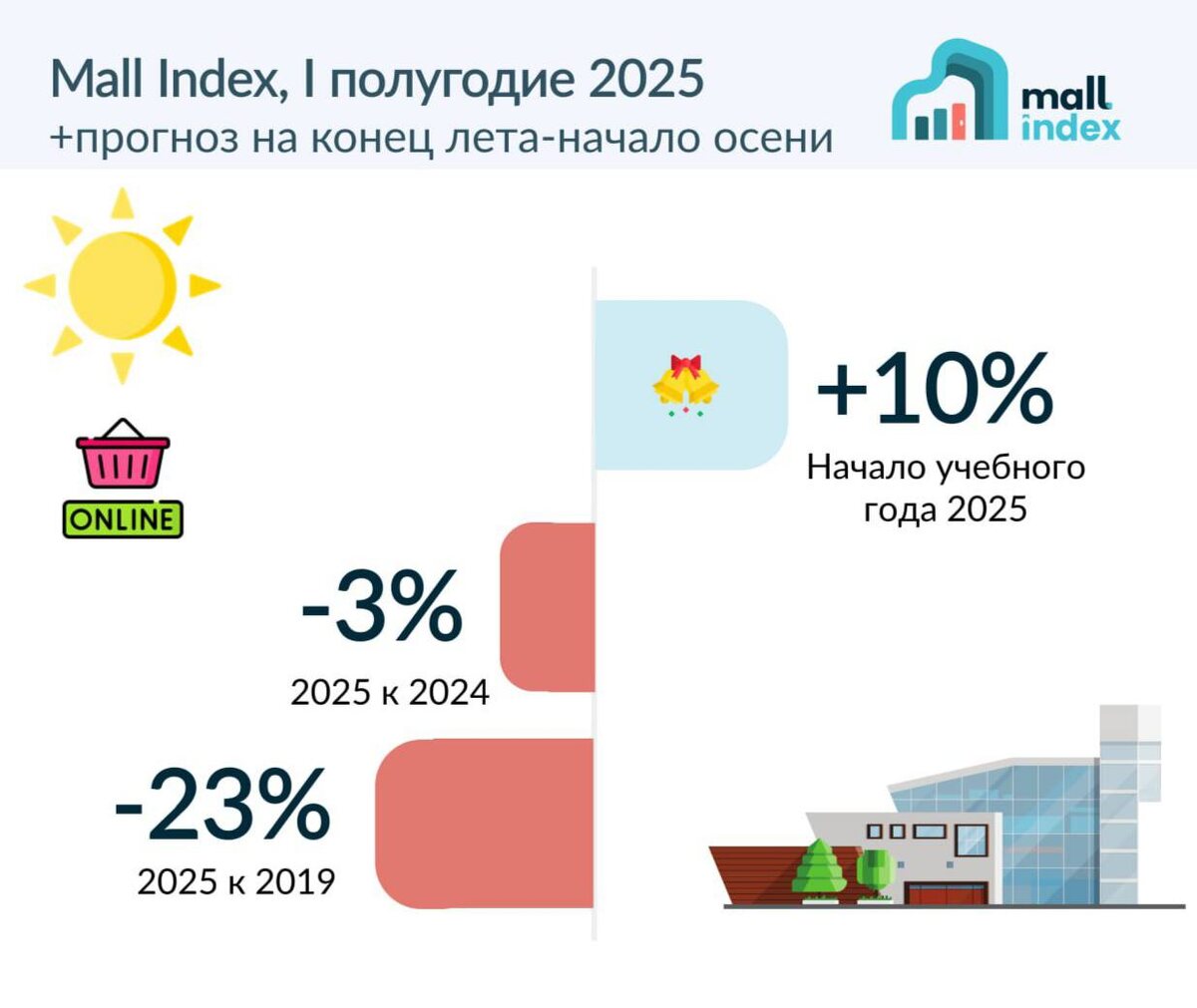 🧭 Mall Index, I полугодие 2025 +прогноз на конец лета-начало осени ТЦ РФ: –3% к 2024 и –23% от 2019 Июнь–июль: –5% 📍Mall Index падает второй год подряд 🍽 F&B удержали трафик: всего –1% 🏪 Растёт доля шаговой доступности и утилитарных визитов: «Горожане чаще посещают объекты в шаговой доступности и комбинируют походы в торговые комплексы с рутинными задачами (аптеки, повседневный ретейл, фудкорт), реже - с длительным шоппингом выходного дня.»– Михаил Васильев, Focus Technologies 📈 Ожидание осеннего пика: +10–12% в августе–сентябре +15% на 35-й неделе года (Back-to-School) «Каждый год мы фиксируем выраженный пик в районе 35 недели года (последняя неделя августа - первая неделя сентября), связанный с началом учебного года и делового сезона. Судя по текущей траектории, в первую очередь мы увидим возврат интереса к ТЦ в Москве, Санкт-Петербурге и крупных региональных агломерациях» –Михаил Васильев, Focus Technologies