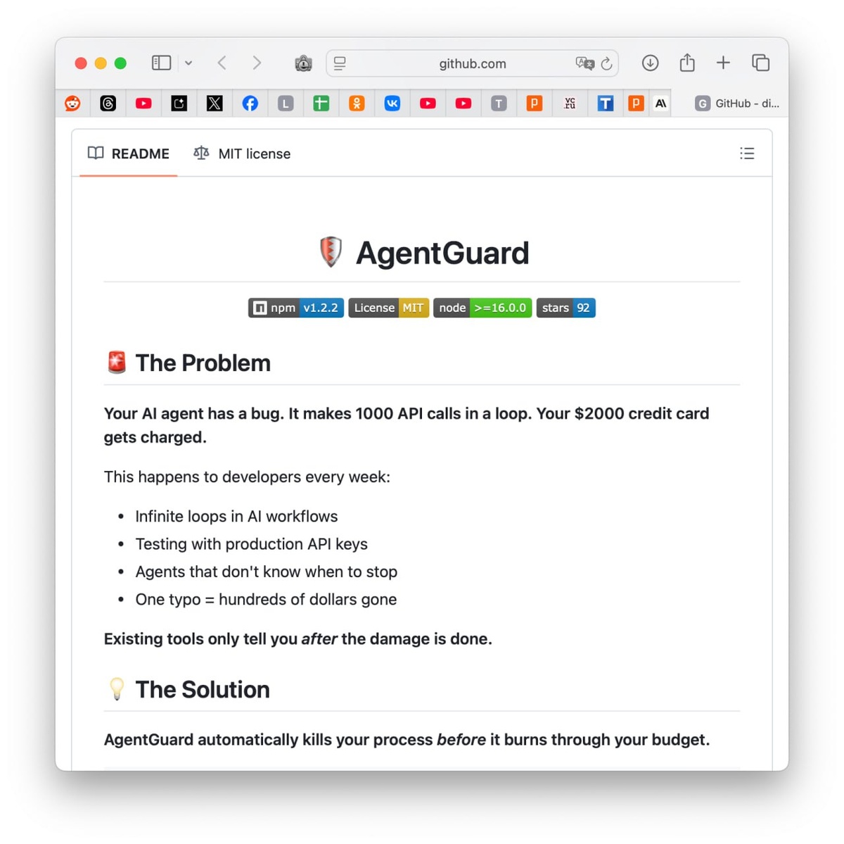 AgentGuard - небольшая библиотека, которая защищает разработчиков от чрезмерных расходов при работе с ИИ. Она автоматически следит за тем, сколько денег тратится на API-вызовы и прекращает выполнение кода, если они превышают установленный лимит. Например, если выставлен лимит в 50 долларов, то код остановится при его достижении, вместо того чтобы случайно потратить тысячу или больше. При этом разработчик получает отчет с точной суммой и детальной статистикой расходов. Прикольно :) Софт умеет отслеживать использование токенов в реальном времени, предупреждать при достижении 80 и 90% бюджета и работает с любыми популярными ИИ API OpenAI, Anthropic и другими. Интересно... Мы руками ставим лимиты сейчас, типа 500 р. в день. Русский ИТ бизнес
