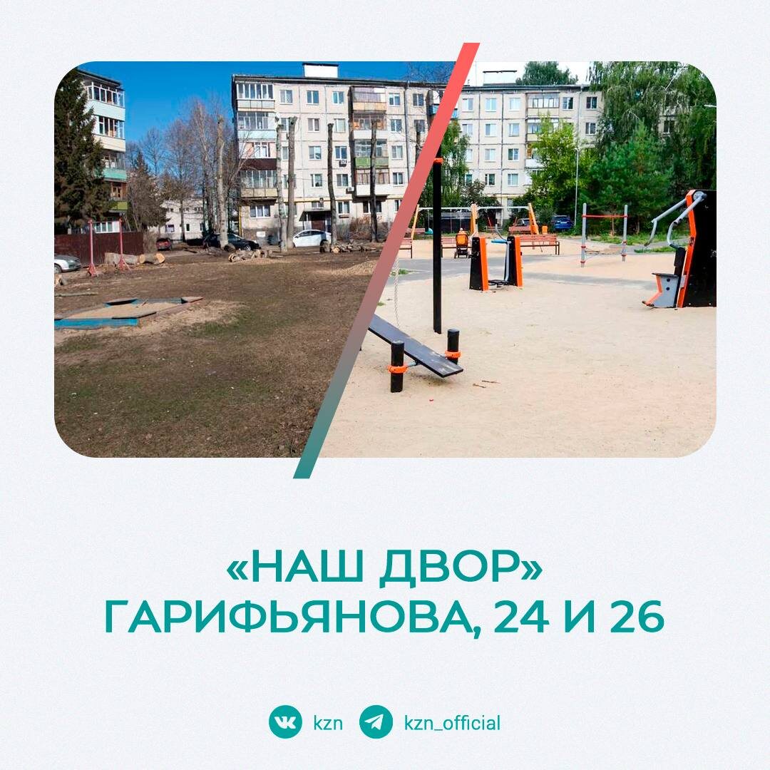 Будь готов — всегда готов… к обновлению дворов 🫡 Завершилось обновление по программе «Наш двор» по ул.Гарифьянова, 24 и 26, ул.Сыртлановой, 15, 17, 19. Здесь появились два детских игровых комплекса, карусели, канатный переход и качели, баскетбольная стойка, тренажеры, площадка для игры в панна-футбол и спортивный комплекс. Во дворе уложили новые тротуары, отремонтировали проезды, обновили освещение. Оценим до/после 👆🏻 @avp_kazan Больше информации в нашей группе, переходите