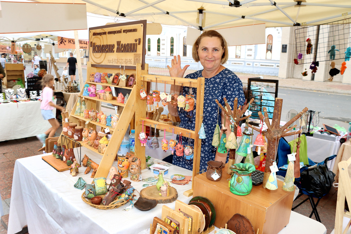 В огромном, в человеческий рост, зеркале застыли капельки прошедшего поутру дождя. Переменчивая погода преподносит свои сюрпризы. Вчера стояла жара, а нынче обещают дождь. Участников и организаторов фестиваля «Купец 2.0» это, конечно, не может не беспокоить. Но, несмотря на капризы погоды, с утра на стерлитамакском Арбате, как любовно называют сами горожане сквер имени Салавата Юлаева, вовсю разворачивались палатки. Подходим к палатке с вывеской «Мастерская авторской керамики «Исполнение желаний». Здесь продают авторские изделия из керамики, интерьерные украшения, колокольчики. В этот раз привезли ещё и декоративное панно из дерева и керамики. Валентина и Дмитрий Поликанины приехали из Магнитогорска. Валентина работает в реабилитационном центре. «Вместе лепим, занимаемся керамикой, ездим по фестивалям, участвуем в конкурсах, – поделилась она. – Основной контингент наших клиентов – женщины от 60 до 80 лет. На гончарном круге делаем разные дактильные упражнения. На фестивале «Купец 2.0»