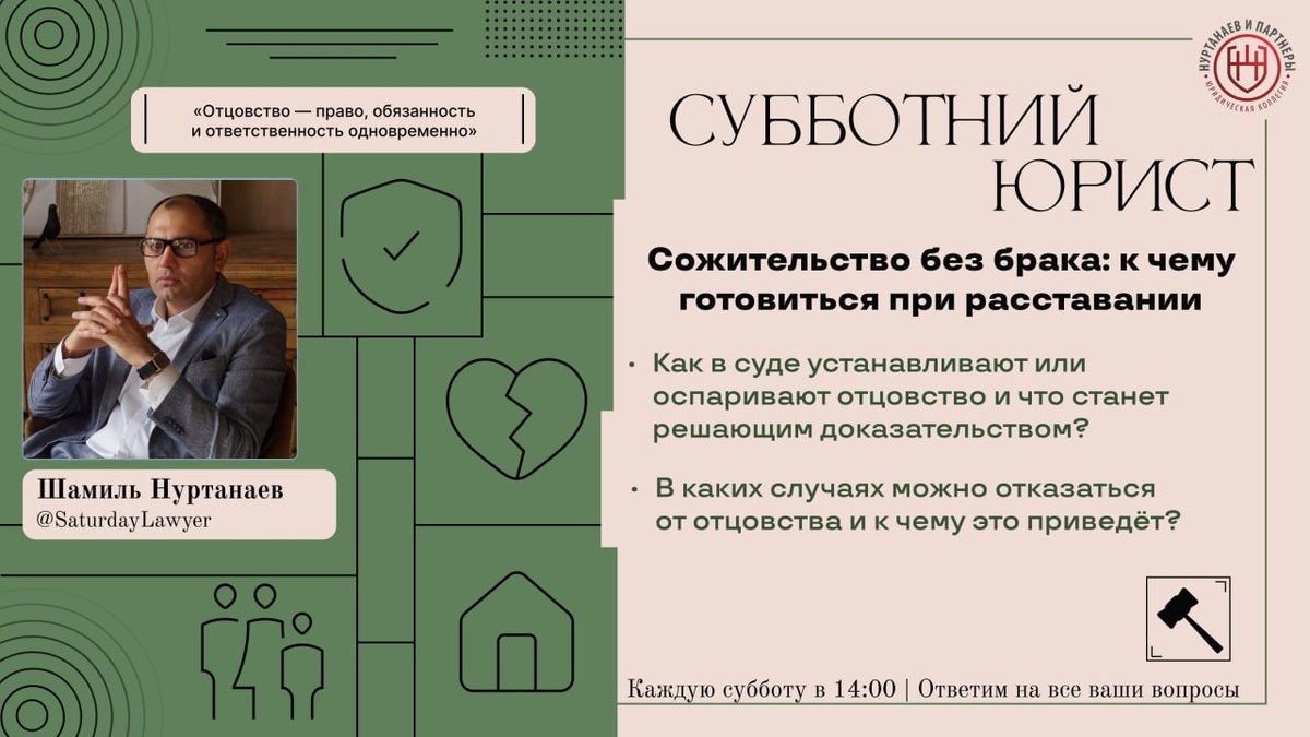 ⚡️⚡️⚡️⚡️Отцовство под прицелом закона: как закон решает судьбу родителей и детей Об этом и о многих других вопросах мы поговорим завтра 9 августа на очередной трансляции "Субботнего Юриста" ⚖️ Эфир проведет юрист с более, чем 20 летней практикой – Шамиль Нуртанаев (нажав на имя вы можете узнать о юристе больше). Тема эфира: «Отцовство по закону» 📝 Вот основные вопросы, которые мы обсудим в эфире: 1. Как в суде устанавливают или оспаривают отцовство и что станет решающим доказательством? 2. В каких случаях можно отказаться от отцовства и к чему это приведёт? Также, каждый может задать свой вопрос любым удобным для вас способом, перейдя по ссылке: https://clck.ru/3ByDxh Или же просто напишите вопрос в комментариях к посту Получите юридическую консультацию, не выходя из дома! 🎥 Записи эфиров на нашем Rutube: https://rutube.ru/channel/40148985/ VK Видео: https://vk.com/video/@vk.nurtanaev Дзен: https://clck.ru/3DQGpA ✅ Присоединяйтесь к эфиру 9 августа 2025 года в 14:00, будет и