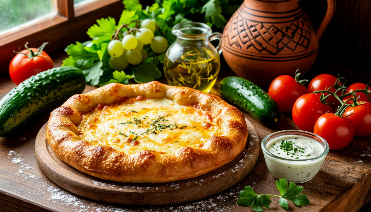 - Хачапури по-имеретински: Круглый, открытый, без излишеств – как домашний пирог.