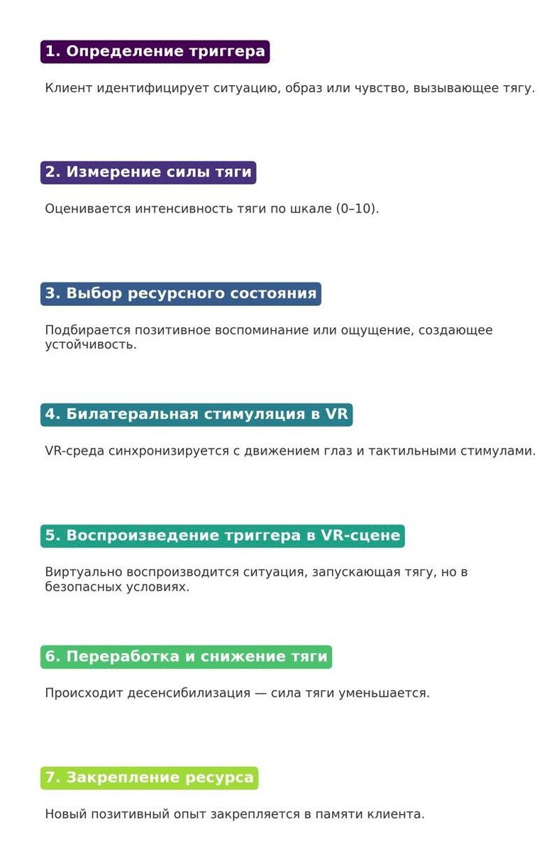 Виртуальная свобода: как GalaPsy VR-ДПДГ помогает избавиться от зависимостей и вернуть контроль над жизнью Зависимость — это не только химическая тяга или привычка, но и глубоко закреплённые в памяти эмоциональные паттерны, часто связанные с травмой. Современные подходы в психотерапии всё чаще используют нейропластичность мозга, чтобы переписать эти паттерны. Одним из самых эффективных методов здесь считается десенсибилизация и переработка движениями глаз (ДПДГ, EMDR), а интеграция с виртуальной реальностью в проекте GalaPsy создаёт качественно новый уровень воздействия на психику. Проблема зависимости и «дисфункциональный позитивный аффект» В аддиктивном поведении часто работает не только избегание боли, но и поиск так называемого «дисфункционального позитивного аффекта» — мимолётных «плюсов» зависимости, которые дают краткосрочное облегчение или удовольствие. Эти реакции глубоко вшиты в нейронные цепочки и подкреплены травматическим опытом. Методы EMDR для работы с зависимостями Кла