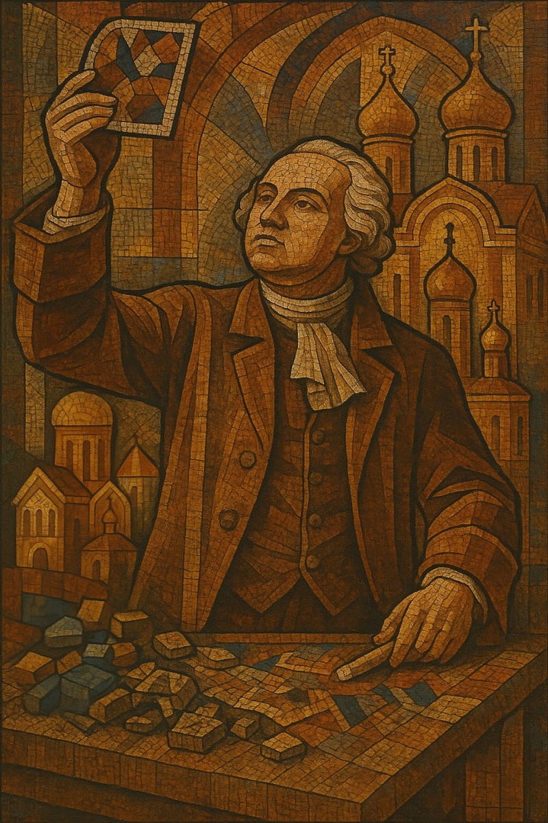 К середине 18 века искусство мозаики в России практически утрачено. Последние известные мозаичные произведения оставались в киевских соборах, а ведущим центром мозаичного ремесла в Европе считалась Италия. Именно в таких условиях Михаил Васильевич Ломоносов поставил перед собой амбициозную задачу возродить древнюю технику. Обладая глубокими знаниями в области стеклоделия и химии, Ломоносов в 1740-х годах сумел заручиться поддержкой государства и создал мастерскую, а также стекольную лабораторию неподалёку от Петербурга. Там он начал масштабные эксперименты по изготовлению цветного непрозрачного стекла необходимой для мозаичной живописи. Ему удалось разработать богатую палитру из более чем сотни стойких цветов и оттенков Первым значимым результатом этих трудов стала икона Богоматери, выполненная Ломоносовым в 1752 году и преподнесённая в дар императрице Елизавете. Через год он завершил мозаичный образ Спаса Нерукотворного, а затем последовали другие работы, позволившие оттачивать техн