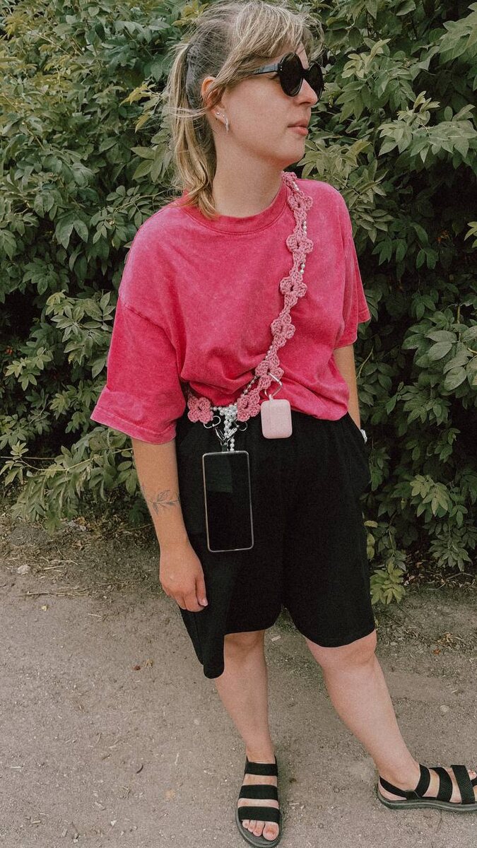 Ремень для телефона получился супер гуд. Удобно, 1️⃣ что можно в отверстия цветков на карабине наушники повесить, да и ещё полно всего; 2️⃣ что вяжется цельным рядом из цветков, не нужно сшивать цветки по отдельности. Да и прочнее так. Вязала из шнура 3 мм, вышло массивно, можно было и потоньше взять. Нужная вещь, я довольна. Могу связать под заказ. Пишите в личку🫶🏻
