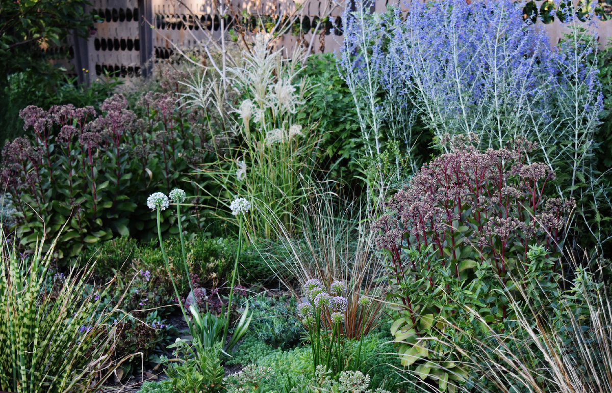 В саду изменился цветник-фаворит. Лилейники, монарды, эхинацеи отдали эстафету очиткам видным и злакам. Поэтому в августе-сентябре мне больше всего нравится цветник на фото выше. Главные роли в нем исполняют очиток "Матрона", перовския и несколько злаков.