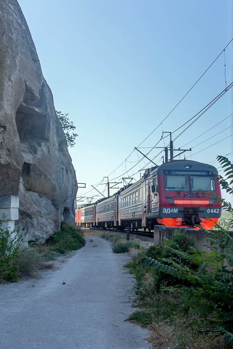 Речь, понятно, о Крыме, причем о таком его уголке, где железнодорожный транспорт сейчас не так уж и активно используется, как мне кажется. Вот по рассказам людей о прошлом – то да, было много чего любопытного. Собственно, все получилось как всегда так, как и положено в «Записках» - случайно. Точнее – по пути. 1-3. Тут вот, когда я в качестве туриста был на одной из экскурсий в районе города Инкермана, а именно в скальном Климентьевском монастыре, обратил внимание, что сам монастырь зажат между скалой и железной дорогой. Еще подумал – было бы здорово, если бы мимо прошел бы поезд. Потом понял – что неудобно было бы фотографировать. Потом дошел до ворот в торце и когда заглянул в щель между створками, услышал звук поезда. Но я-то натренирован уже быстро доставать фотоаппарат, так что почти успел. Точнее, как раз успел сфотографировать хвост электропоезда ЭД4М-0422, уходящего за скалу по изгибу путей. Целиком бы он совсем не поместился, но хоть так. И вот что еще любопытно. Этот электропо