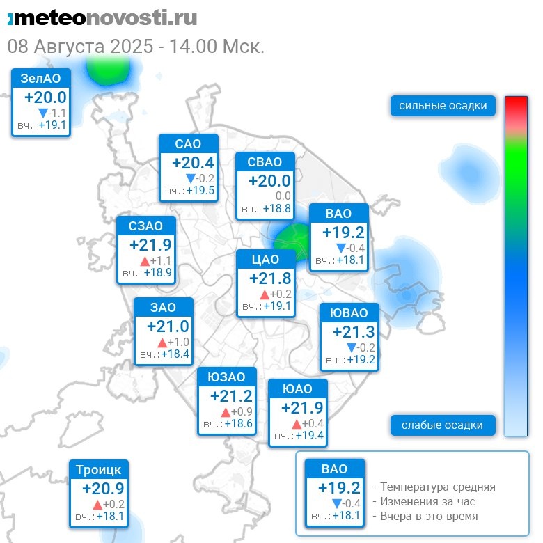 В 14:00 в Москве было от +17.4°C до +24.1°C, средняя температура +21.2°C #погода #Москва #лето #температура #8августа #пятница