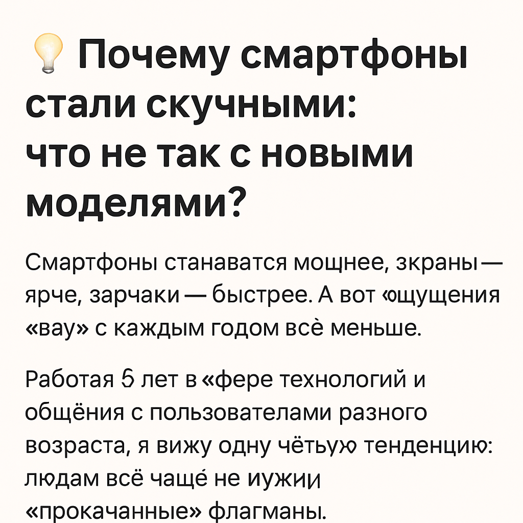 неважно, какой у вас процессор или количество камер. Гораздо важнее: Выбирая смартфон: Пишите в комментариях: 📌 Подписывайтесь на канал, чтобы получать понятные советы, обзоры без перегруза и рекомендации, которые подходят всем — от школьника до пенсионера.