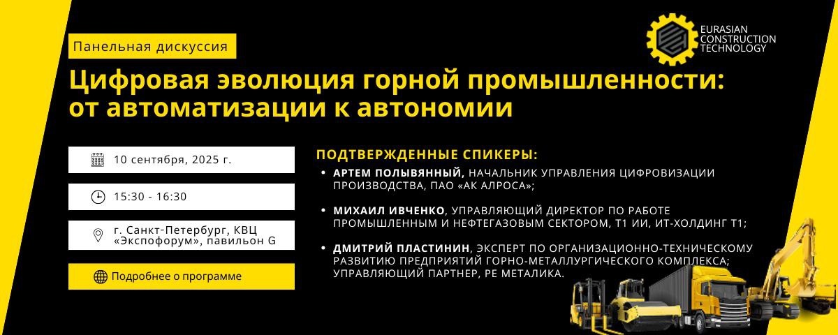 XXI век диктует свои правила. Инновации меняют все сферы жизни. Горная промышленность идет в ногу со временем, что создает новые возможности и вызовы. Цифровые двойники, ИИ, беспилотные решения и интеллектуальная логистика трансформируют горную отрасль, переходя от локальной автоматизации к полной автономии процессов. Новые цифровые экосистемы способны объединять данные, алгоритмы и инфраструктуру, создавая "умные" месторождения и карьеры — безопасные, предсказуемые и эффективные. В рамках деловой программы Eurasian Construction Technology 2025 состоится конференция "Цифровая эволюция горной промышленности: от автоматизации к автономии". В фокусе — практические кейсы, технологические горизонты и системный подход к цифровизации горного производства. Темы для обсуждения: — Цифровые двойники месторождений: комплексный подход от разведки до добычи. — ИИ и предиктивная аналитика: практическое применение в горном деле. — "Умные карьеры": автоматизация процессов на основе IoT-решений. — Беспи