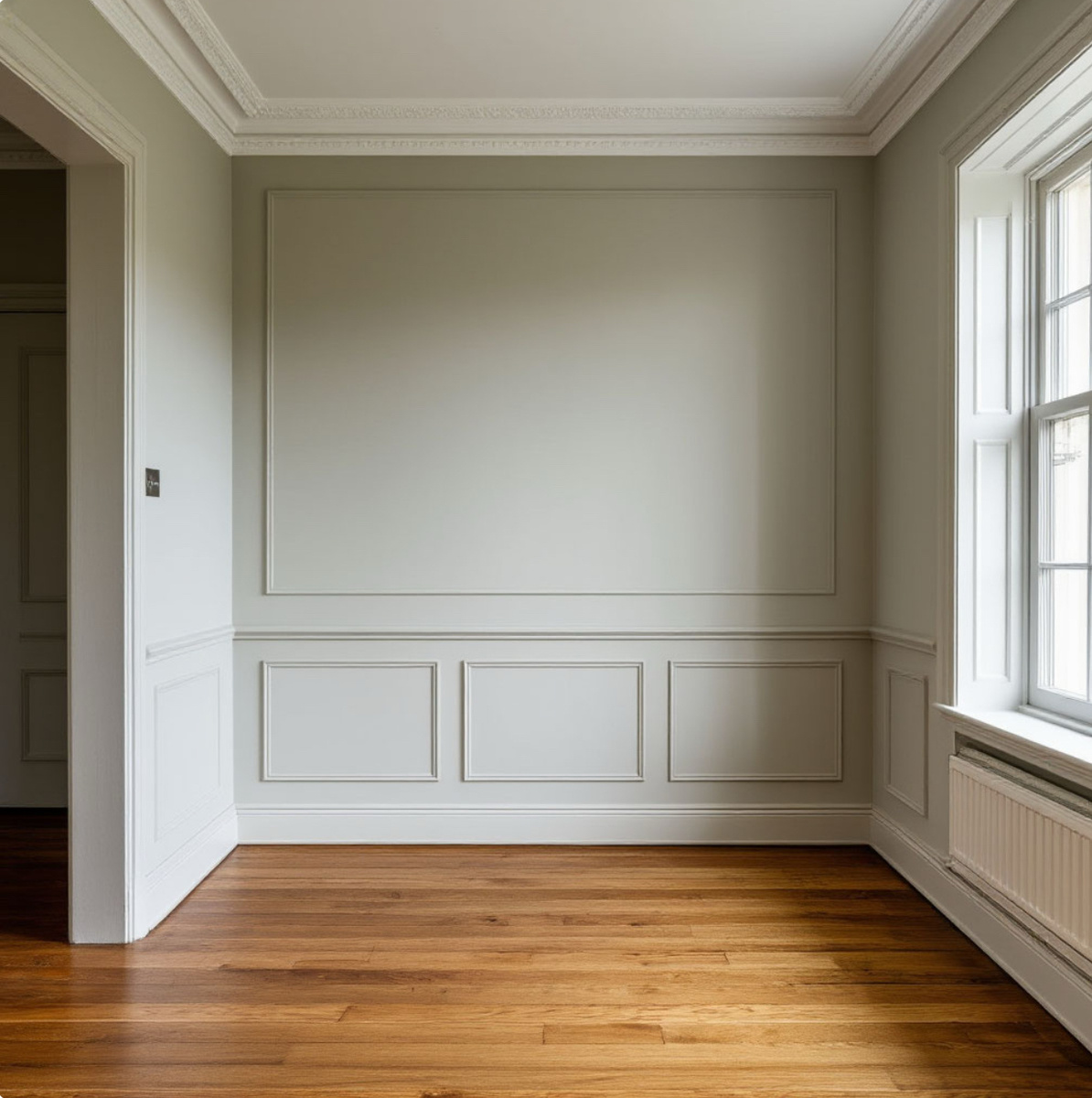 * Классика, Неоклассика: Стены теплых пастельных тонов или глубоких цветов (бирюза, бордо), пол средней тональности (орех), плинтус в цвет пола (часто высокий, профилированный).