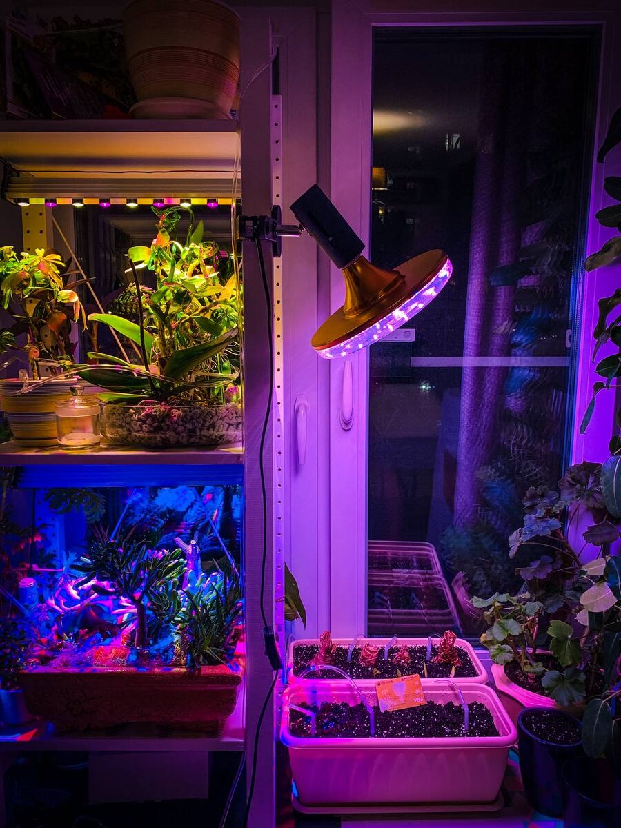 Как я пришёл к домашним джунглям 🌿 С самого детства в нашем доме было много цветов. У каждого — свой уголок на подоконнике: у мамы, у папы, у бабушки… и, конечно, у меня. Настоящие цветочные кварталы! Но об этом я как-нибудь расскажу отдельно — тема обширная и тёплая. А пока — история одной ошибки, которая в итоге привела к целому зелёному перевороту. Когда делал ремонт в своей комнате (а она у меня южная, солнечная), решил установить стеклопакеты с напылением, которое якобы защищает от жары и ультрафиолета. Звучало современно и технологично: солнце вроде бы светит, а в комнате прохладно. Но всё оказалось не так просто. ⚠️ Вместе с теплом это напыление «отсекло» и жизненно важные для растений световые лучи. Цветы начали чахнуть, листья бледнели, рост остановился. Я смотрел на это с ужасом — мой маленький зелёный мир буквально таял у меня на глазах. Тут началось погружение в мир фитосвета, ламп, спектров и полок. Первый вариант — стеллаж на подоконнике с досветкой — спас ситуацию,