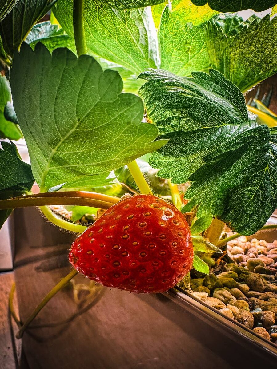Моя маленькая клубничная история 🍓 Месяц назад на одном из маркетплейсов увидел корневища садовой земляники, и цена была настолько привлекательной, что я не смог устоять. Решил попробовать посадить дома! Выбрал сорт Гирлянда — ампельный, ремонтантный, с такими прекрасными перспективами. Сорт был выведен в 2003 году селекционерами Тимирязевской академии, а название получил за свою способность «плестись» по краю горшка, как гирлянда. Про сорт сказано много, и всё, что о нём говорят, оправдывается. У Гирлянды длинный срок плодоношения, и эта клубника может радовать нас до самых холодов. Оказавшись в руках опытных селекционеров, она устойчива к болезням, а вот суровые зимы и засушливые летние дни ей не страшны. Посадочный материал пришёл хорошего качества, хоть отзывы были разные. Но через неделю меня уже радовали маленькие зелёные кустики, а ещё через неделю — первые цветочки! Спустя чуть больше месяца… первый урожай! А какая это сладкая и ароматная клубника! Каждый плод — как малень