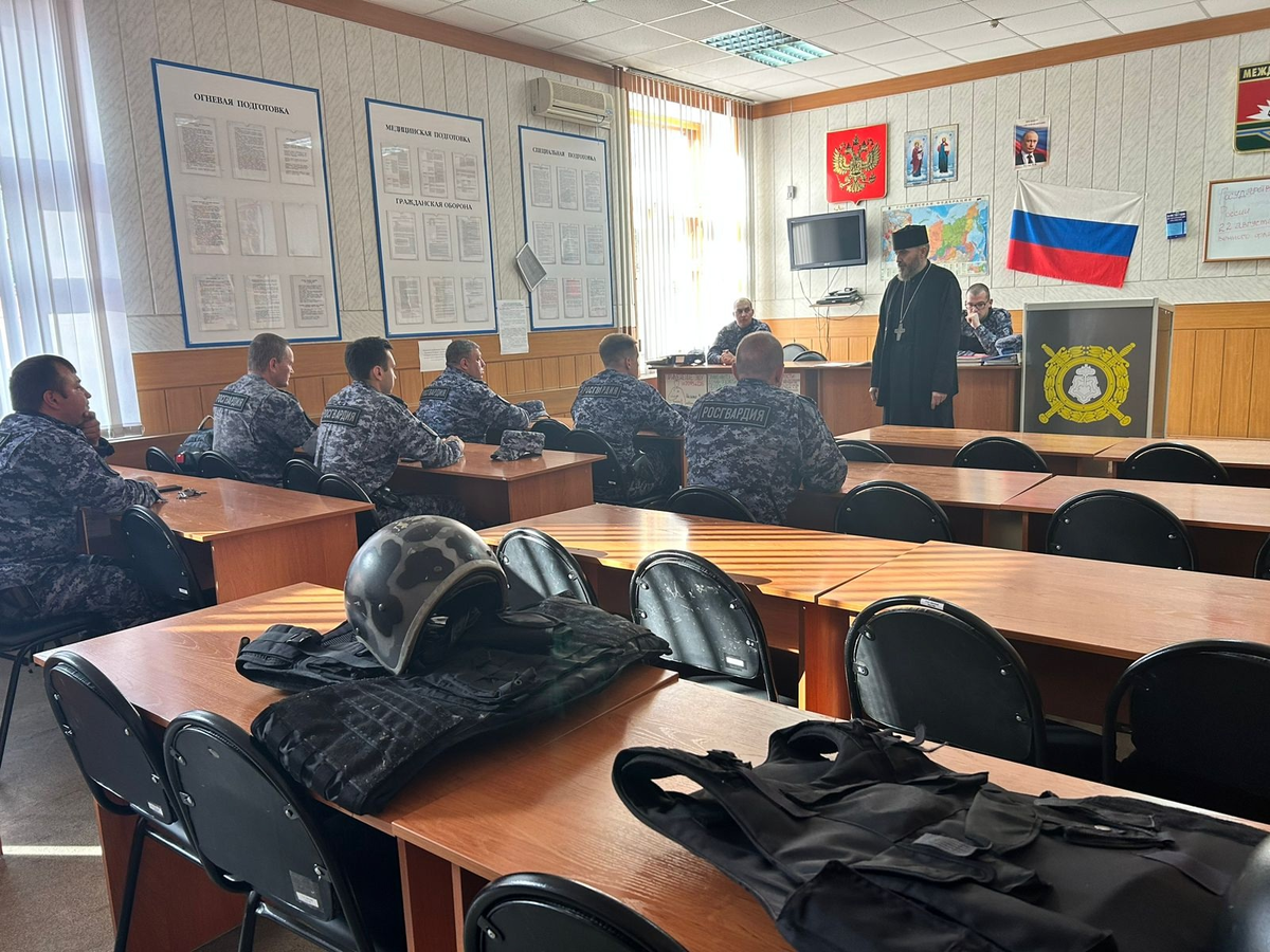 8 августа 2025 года благочинный 2-го Междуреченского округа, настоятель храма святителя Николая Чудотворца протоиерей Максим Гребенюк провел беседу с личным составом Росгвардии.